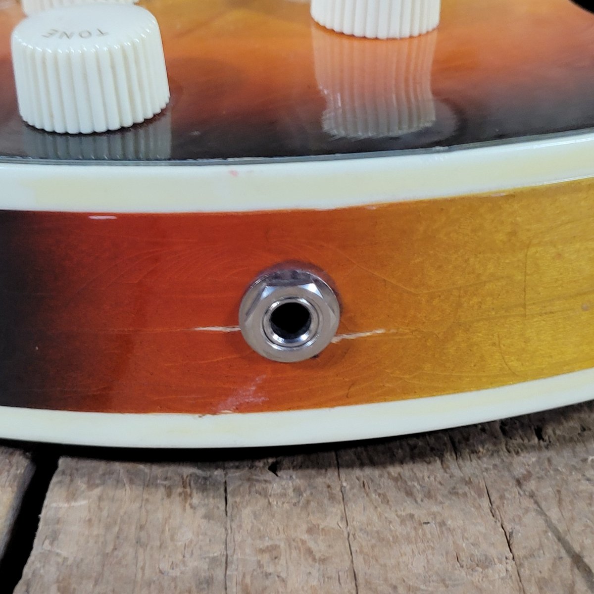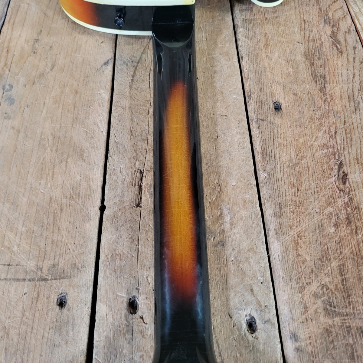 The twin DeArmond “Golden Tone” pickups produce rich, airy cleans and gritty vintage overdrive when pushed—making this model a favorite among roots, rockabilly, and blues players. The original sunburst finish retains a deep luster, accented by a raised tortoiseshell pickguard and chrome hardware. This example includes its original case and shows only light wear for its age, with all electronics functioning perfectly.