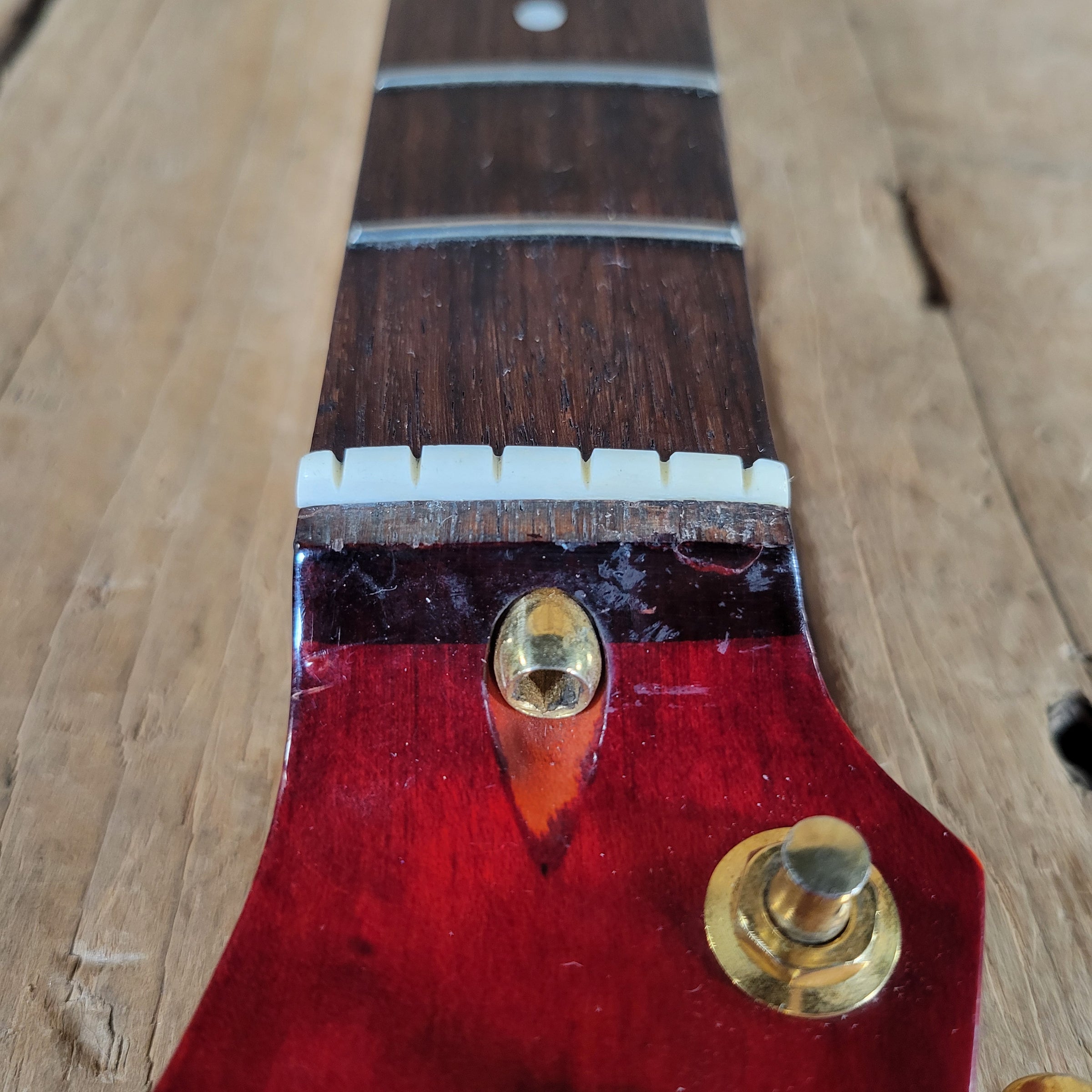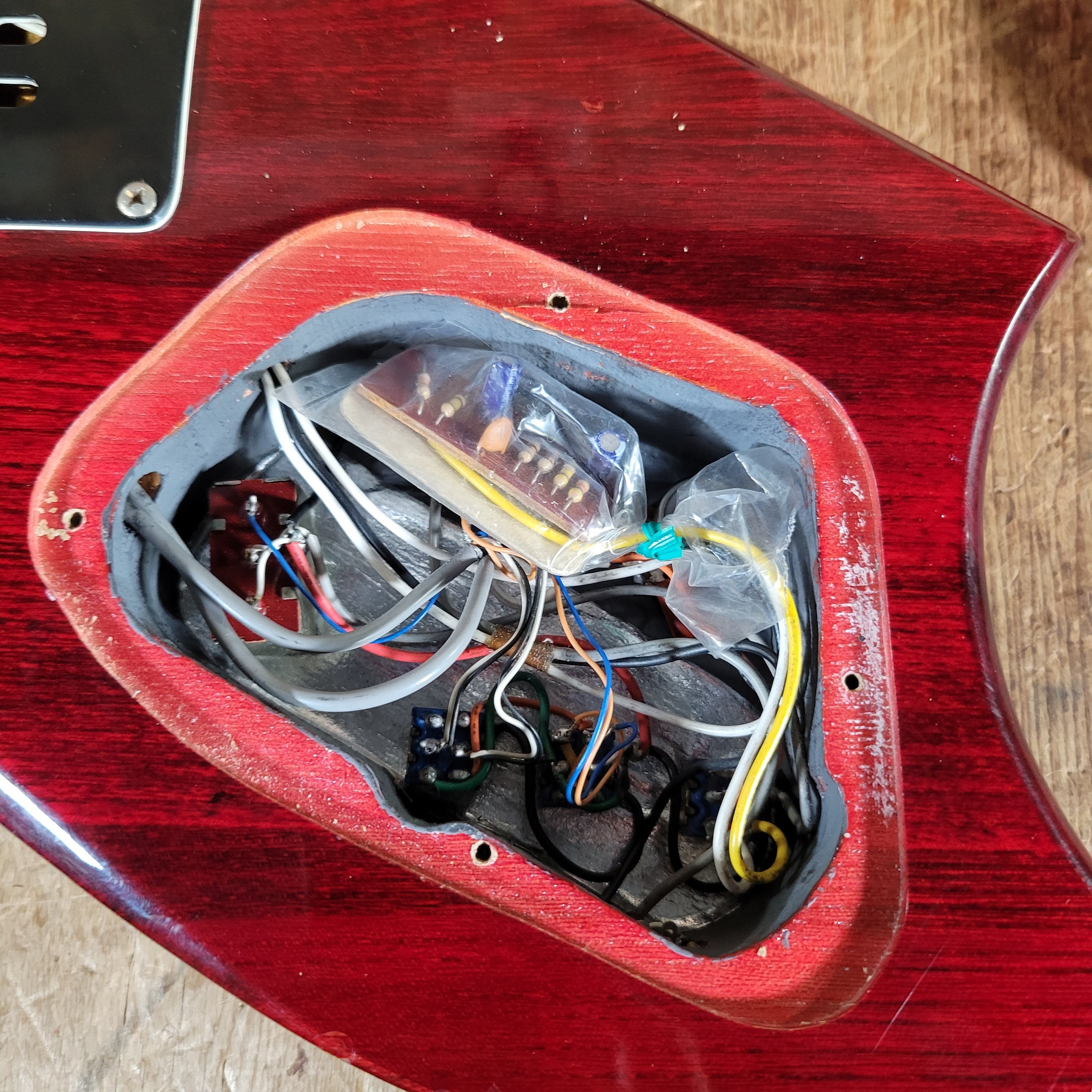 The guitar appears to be all original.  The frets are in excellent condition.  The neck relief is very flat.  We set it up with 10-46 strings, and there is a touch of fretting out in the lower register.  There is a finish check line across the neck seam where it hits the body.  Hondo used a wild looking joint there - the guitar is not neck-thru-body constructed.  The joint includes a zigzag, presumably to offer more surface area in the joint.  There is no wood or glue separation there - just a line in the finish.
