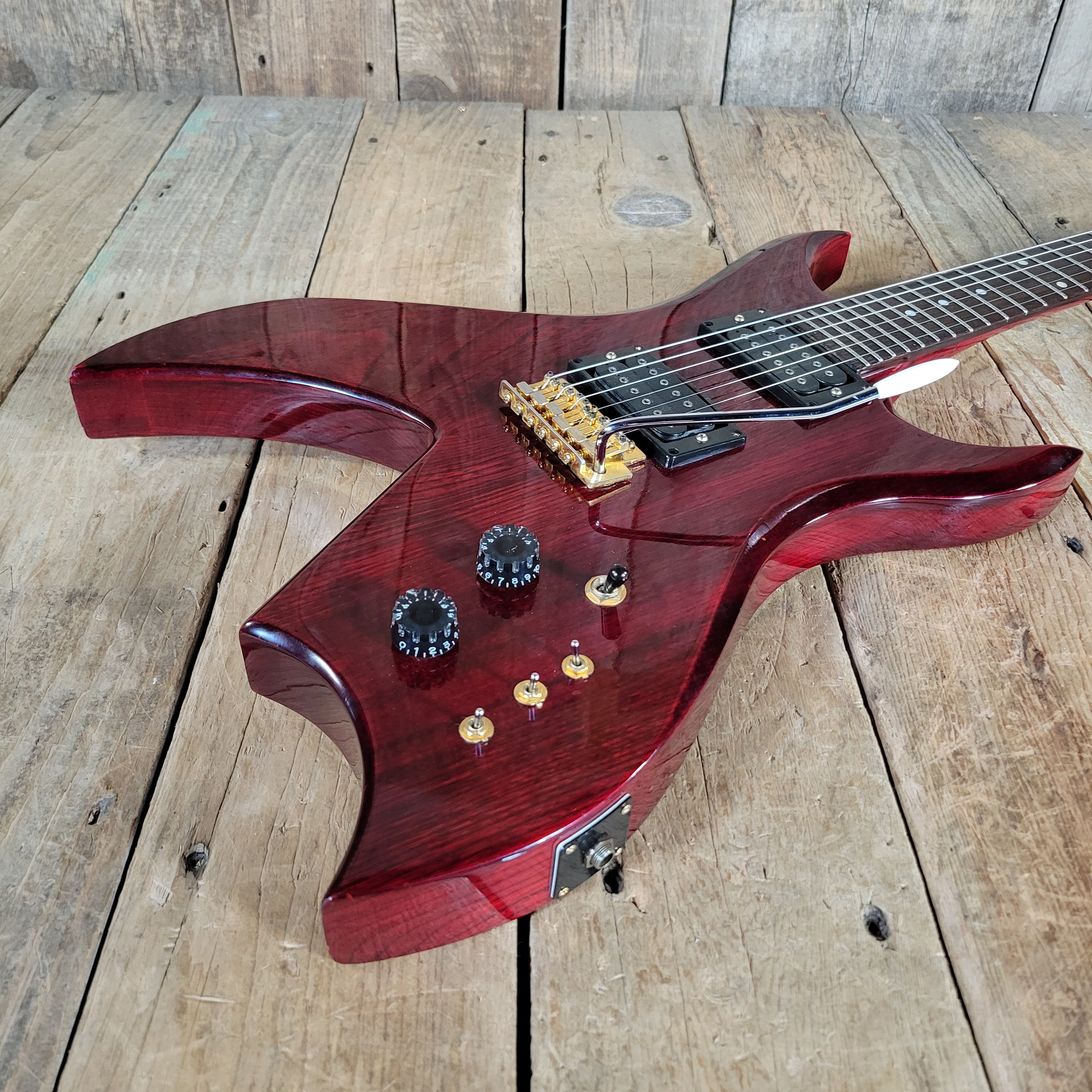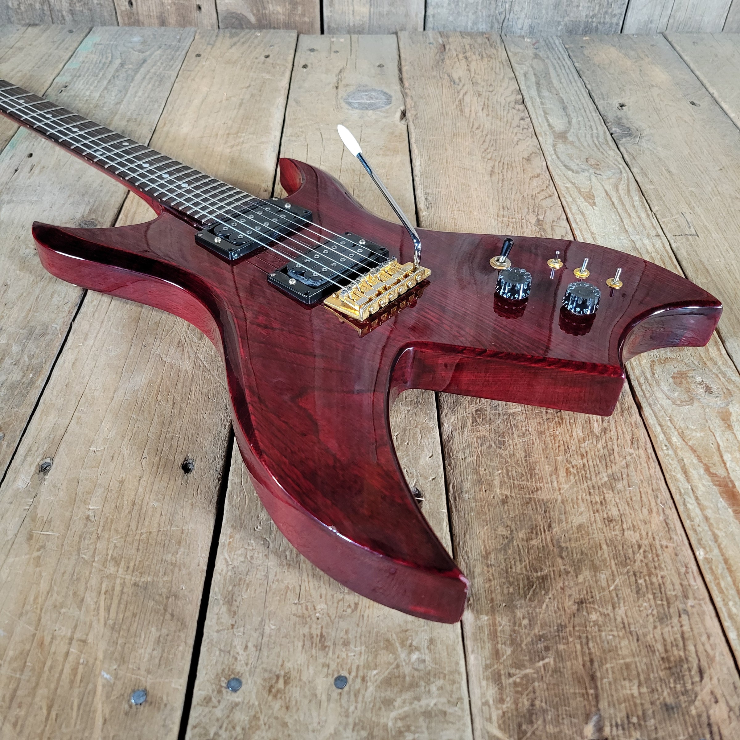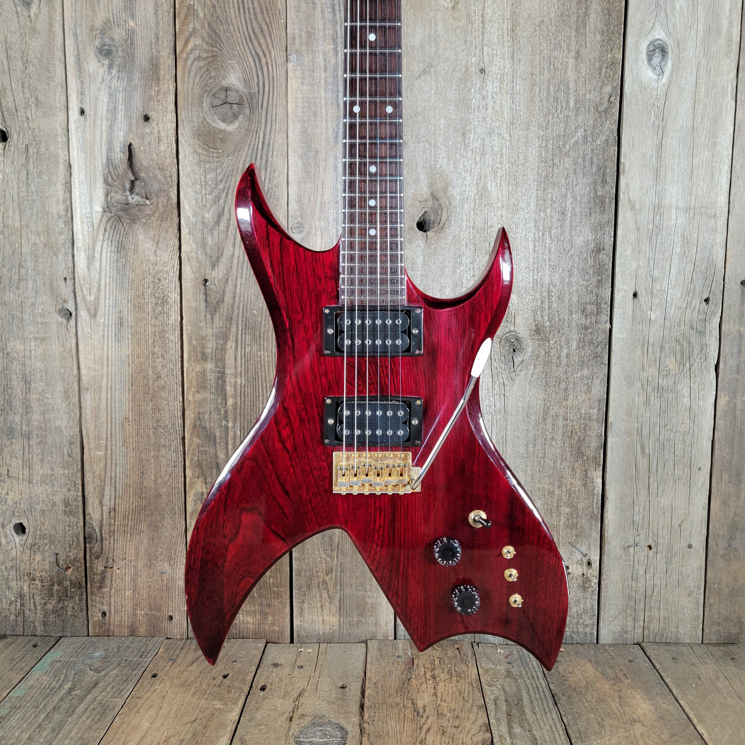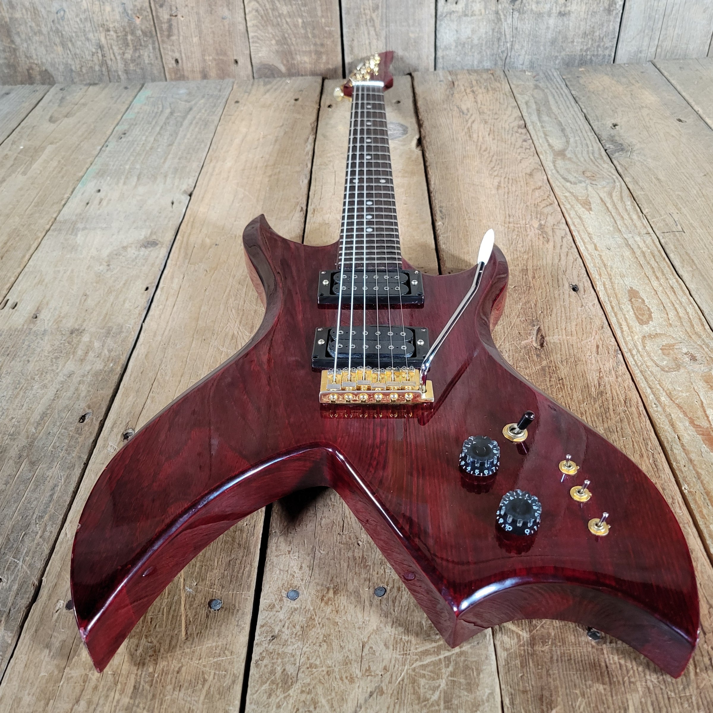 The Hondo Formula 1 H-785, made in the 1980s, is a bold and rare electric guitar designed for fast, high-octane playing. This model features a striking Transparent Red finish over a contoured body with sharp double cutaways, giving it a sleek, performance-driven aesthetic that stands out on any stage.