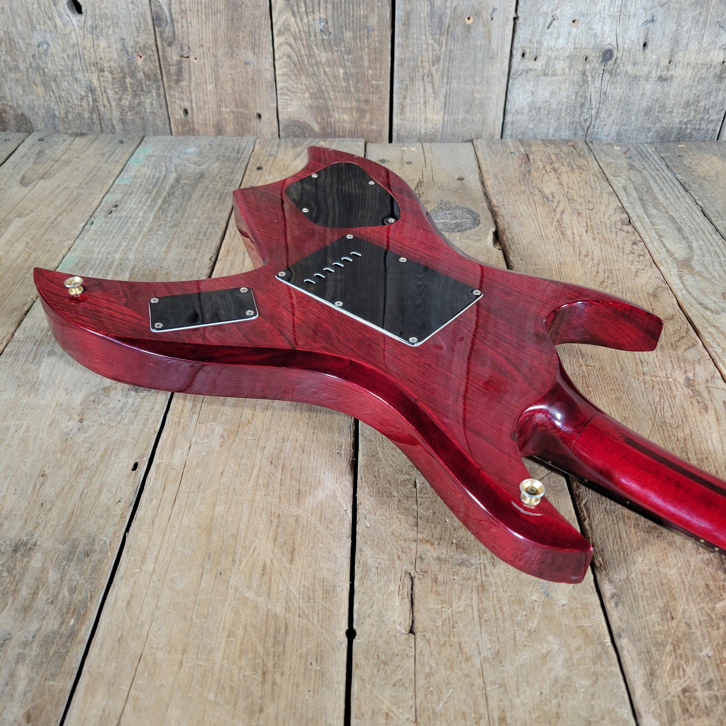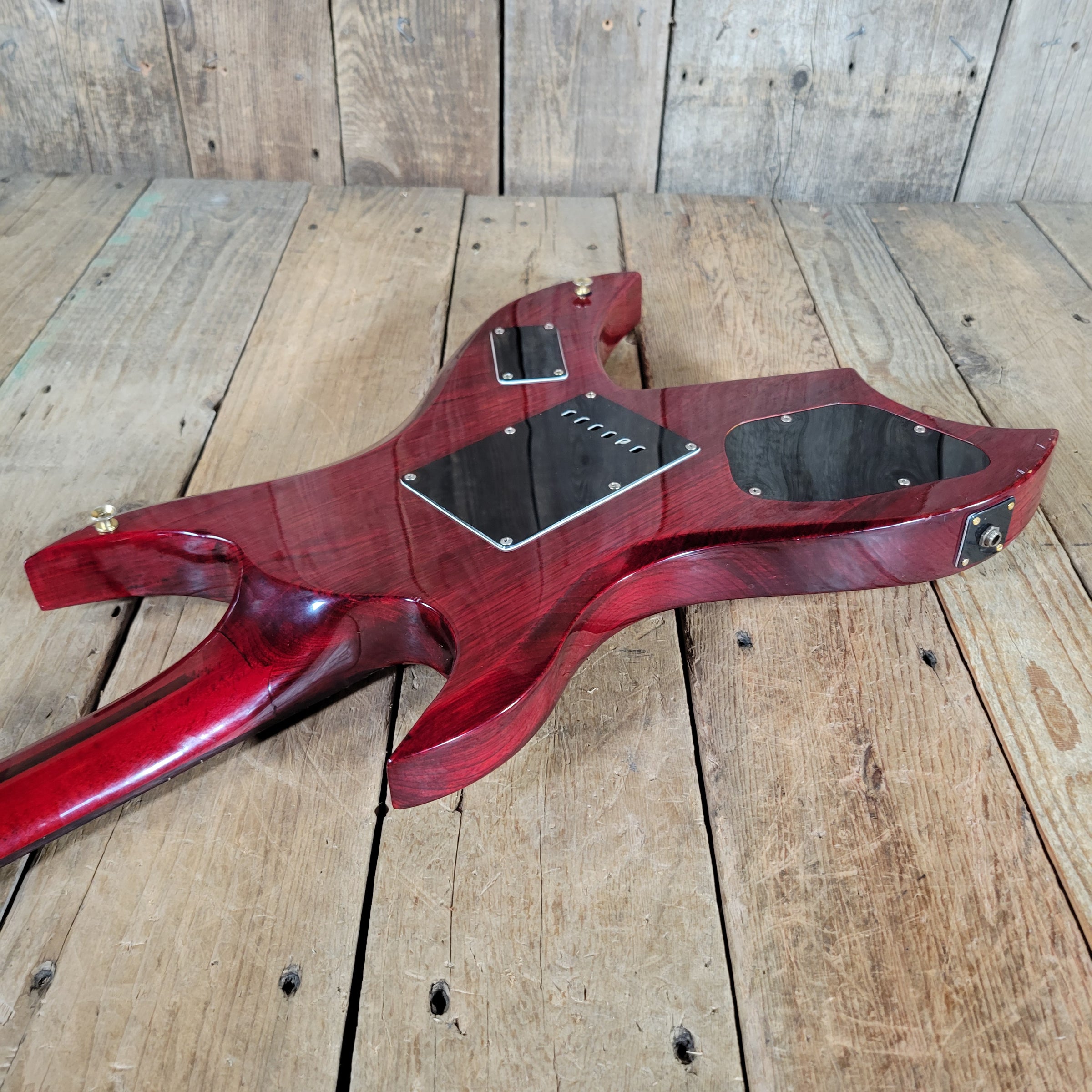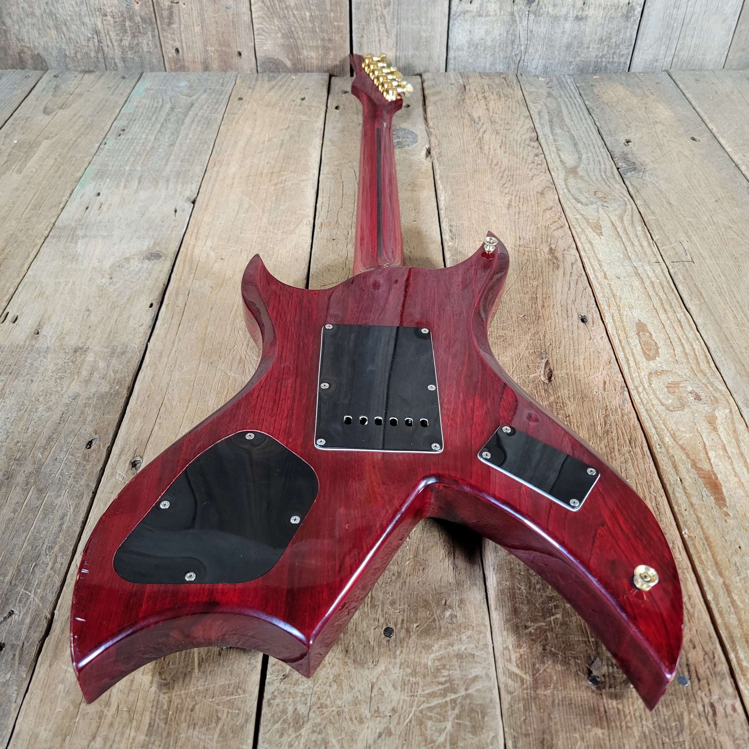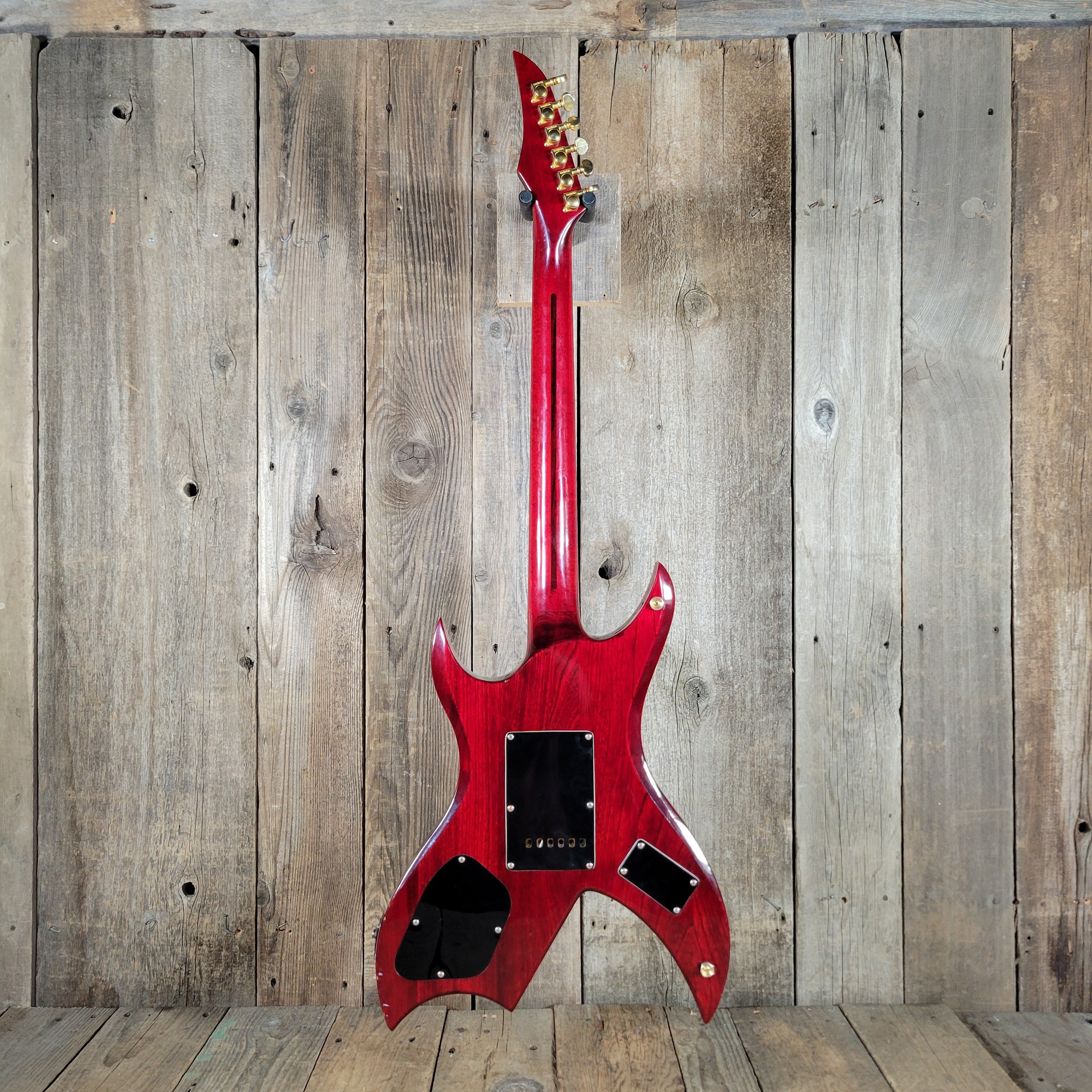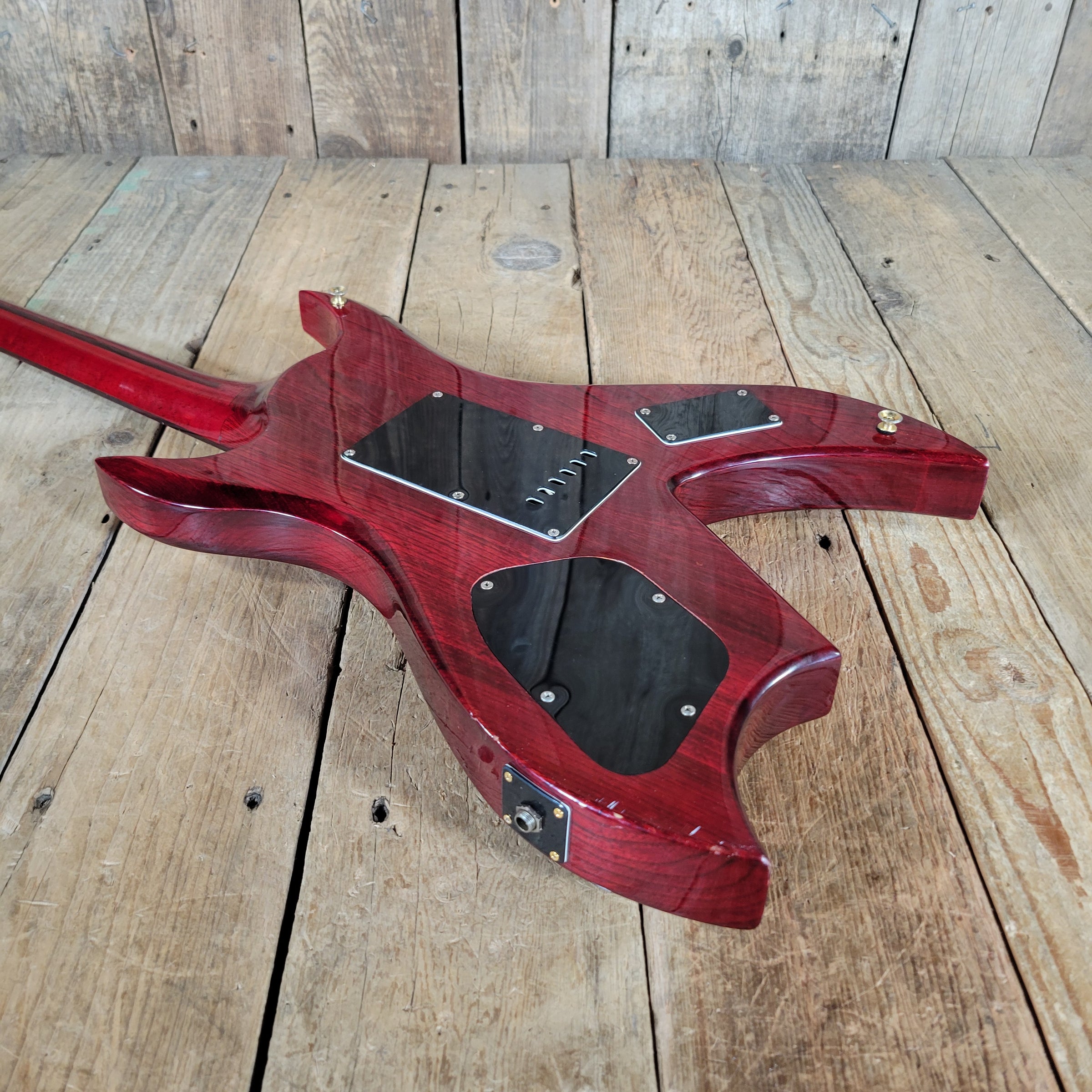 The Hondo Formula 1 H-785, made in the 1980s, is a bold and rare electric guitar designed for fast, high-octane playing. This model features a striking Transparent Red finish over a contoured body with sharp double cutaways, giving it a sleek, performance-driven aesthetic that stands out on any stage.