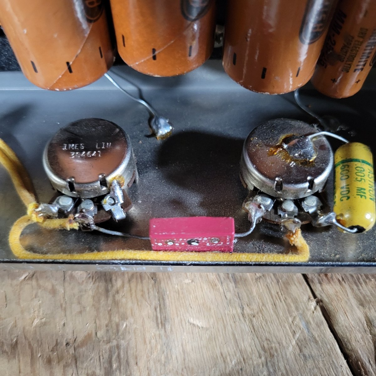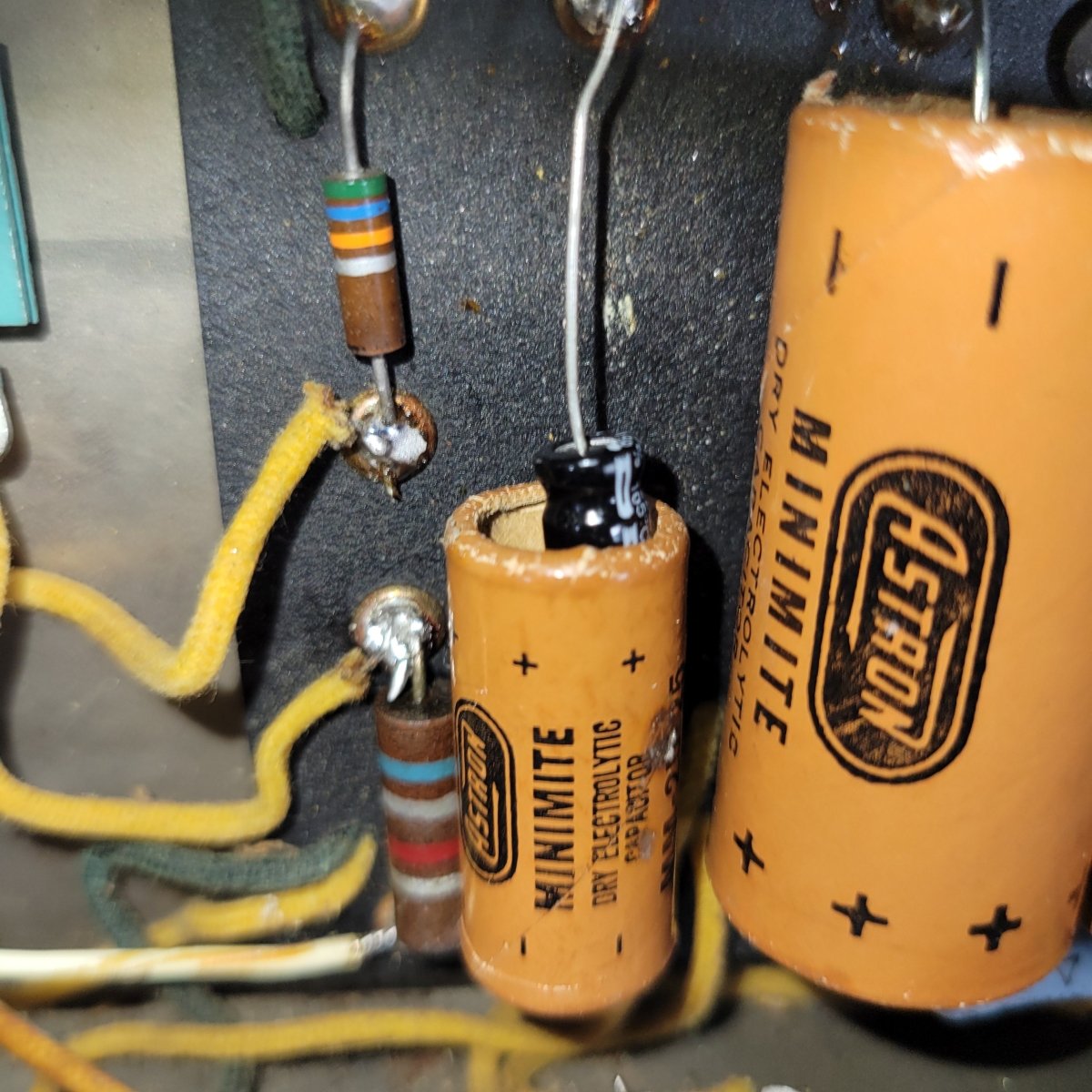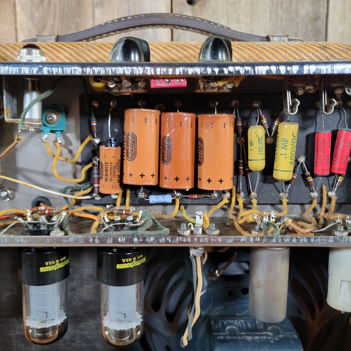 The amp arrived here in nearly 100% original condition, with just a changed power cable and handle.  The original, broken handle is included.  The electrolytic caps were in desperate need of replacement so I swapped them out and housed the new ones inside the original Astron sleeves.  The rest of the amp checked out perfectly, so we tested the tubes, cleaned the pots and tube sockets, and now the amp is 100% ready to rock.  The original parts that I changed out will be included with the amp.