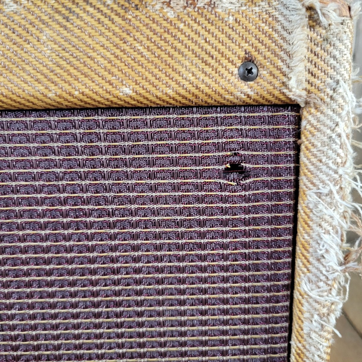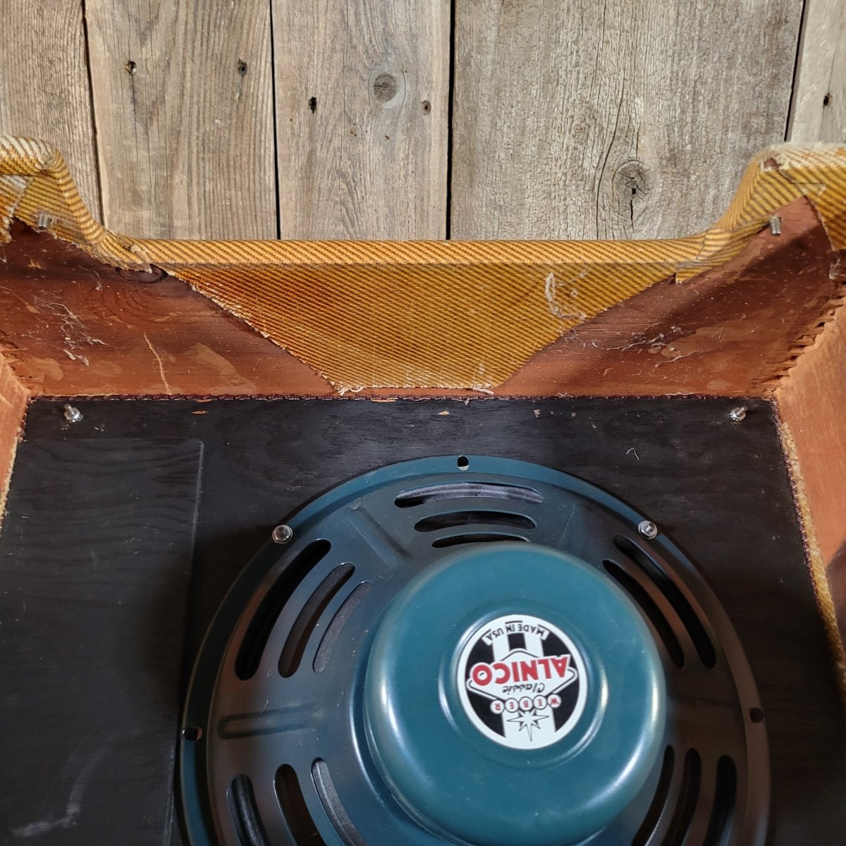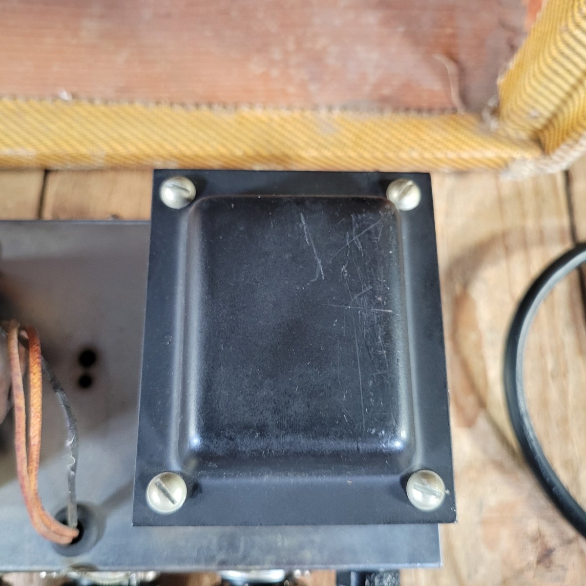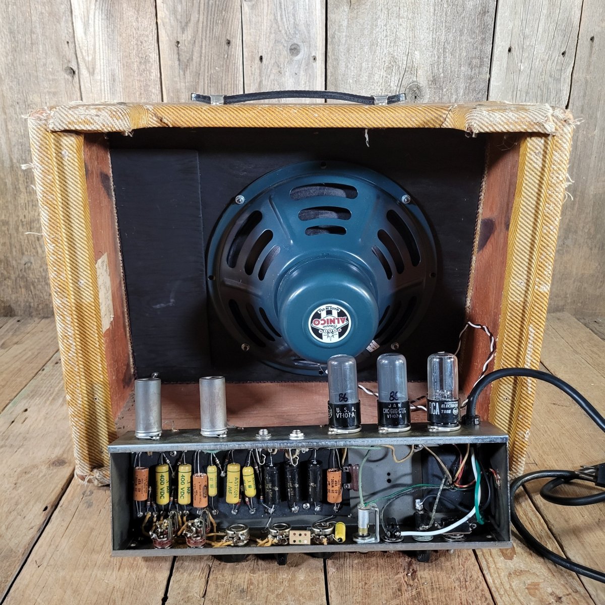 The transformers are original. The speaker is a Weber Alnico replacement that sounds killer. The baffle was cut, perhaps as a port or maybe for a tweeter or something. That cutout was covered with a piece of similar wood before the amp came here. The amp was then regrilled. The tweed and back panels are original. The handle is a replacement.