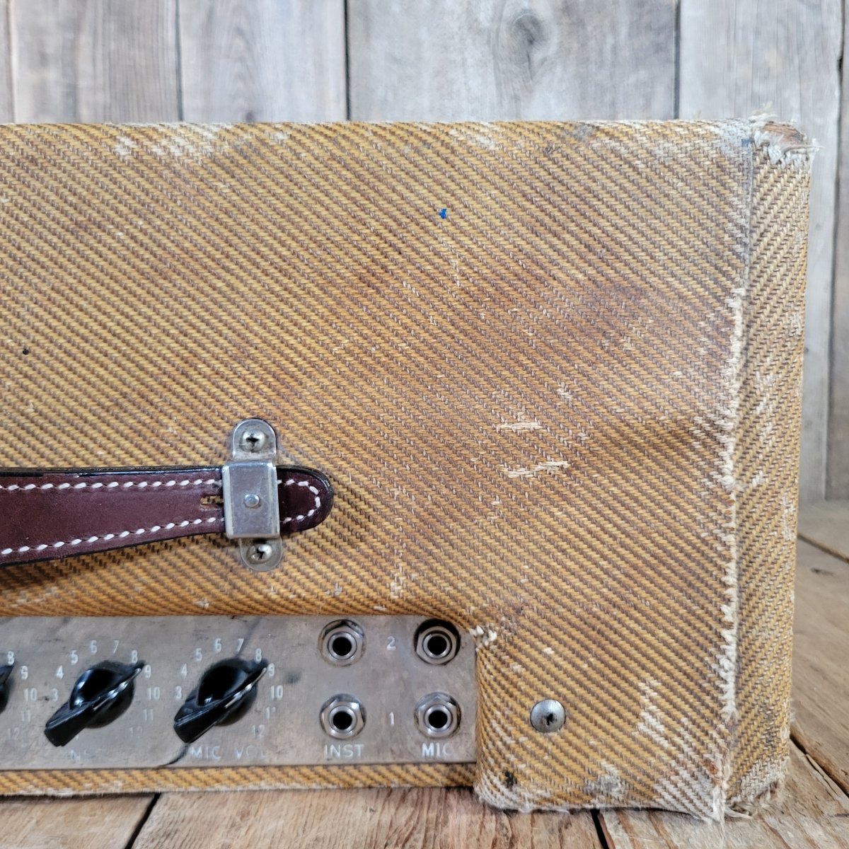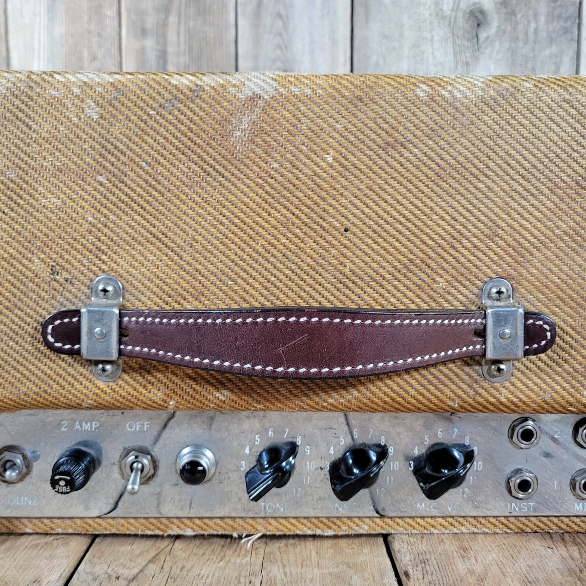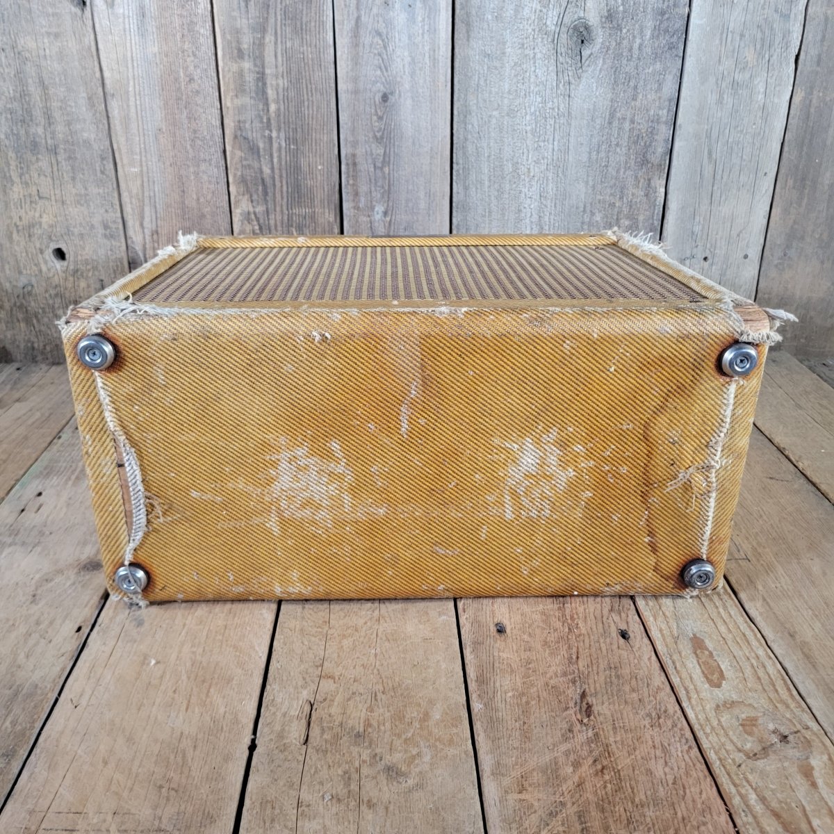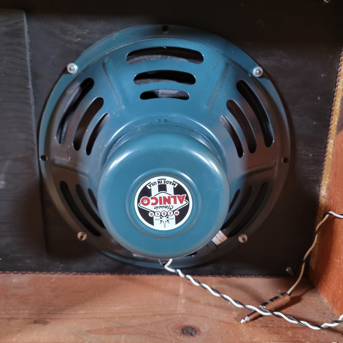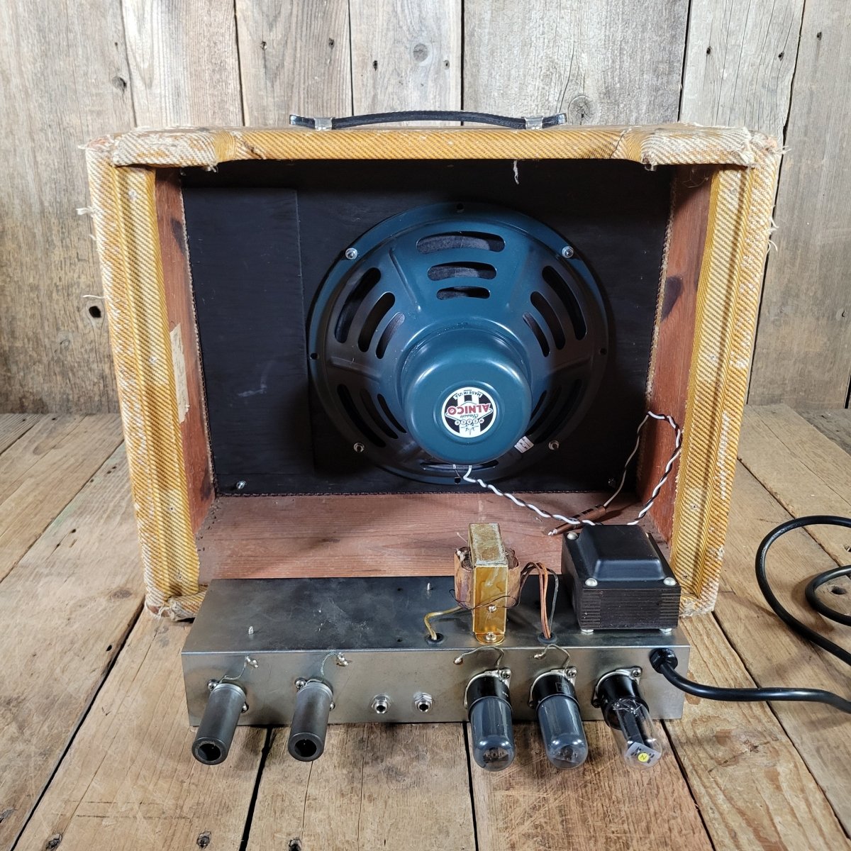 The transformers are original. The speaker is a Weber Alnico replacement that sounds killer. The baffle was cut, perhaps as a port or maybe for a tweeter or something. That cutout was covered with a piece of similar wood before the amp came here. The amp was then regrilled. The tweed and back panels are original. The handle is a replacement.