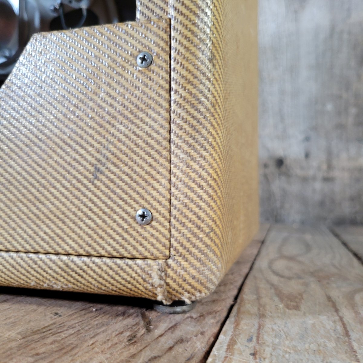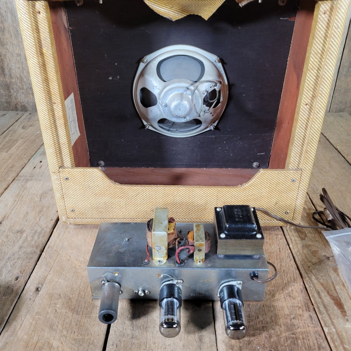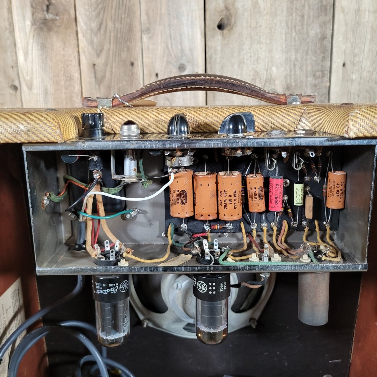 With its lacquered tweed covering, original 8-inch speaker, and classic hand-wired circuit, the 5E2 delivers warm cleans, rich midrange, and smooth breakup at studio-friendly volumes. Powered by a single 6V6 tube with 5Y3 rectifier and 12AX7 preamp tube, it produces around 4–5 watts of pure vintage tube tone—ideal for recording, home use, or mic’d stage work.