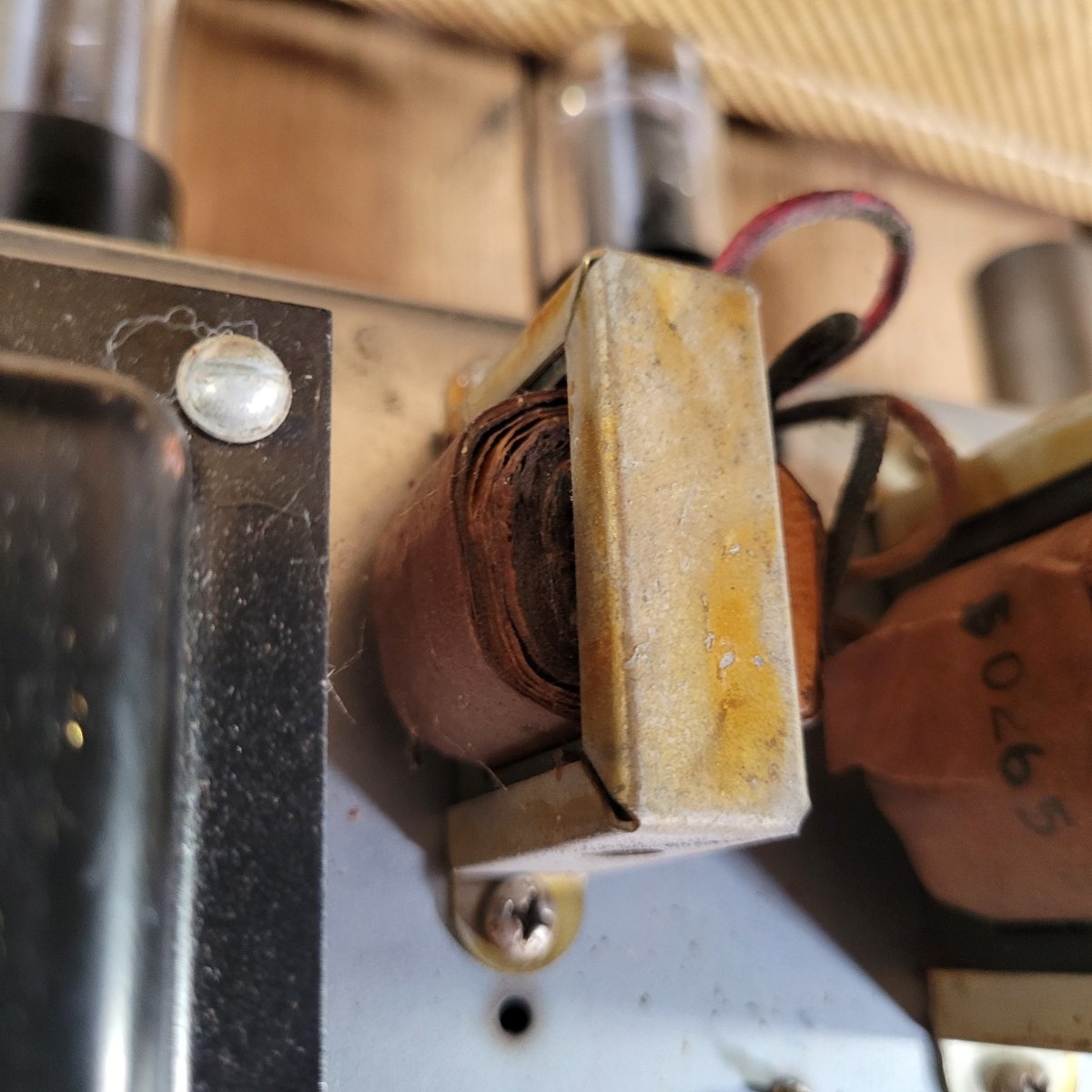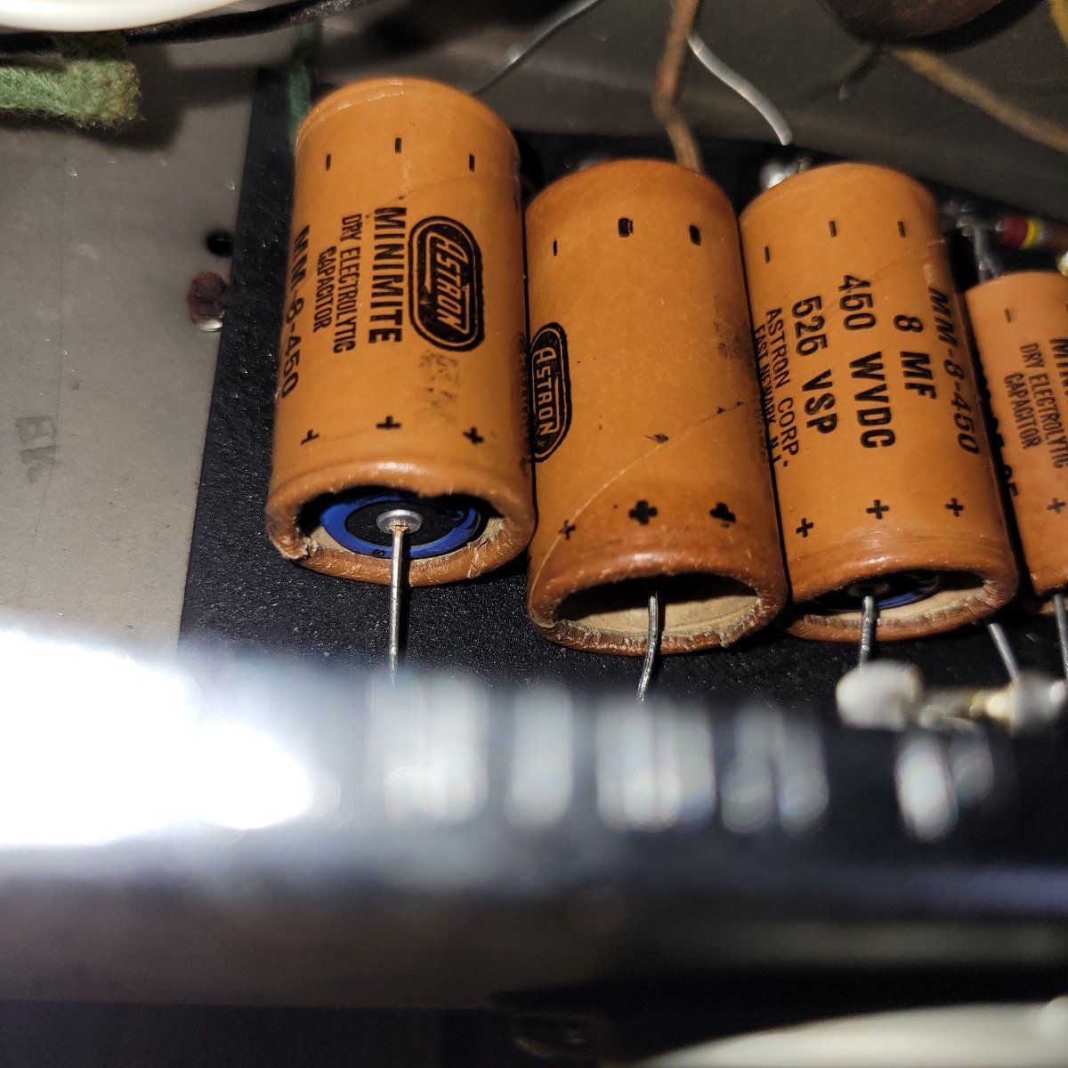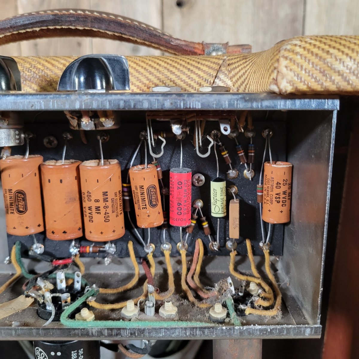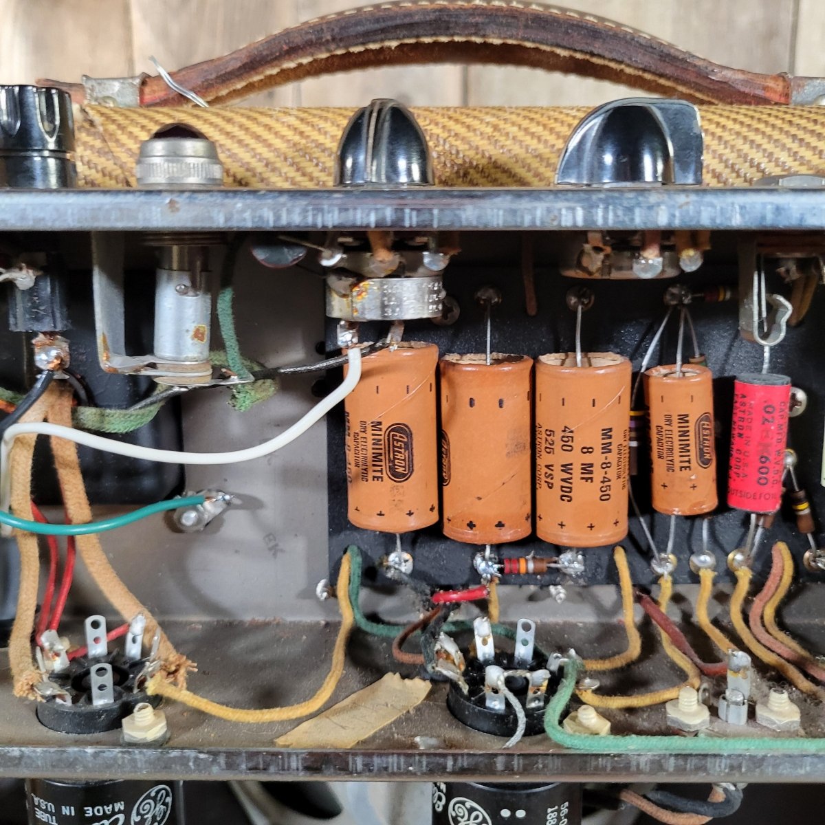 The amp came to us as a 100% original example.  It was apparent immediately that a cap job was necessary, so I did the work here in the shop.  The original electrolytic caps were retained and I installed the new caps inside their original sleeves.