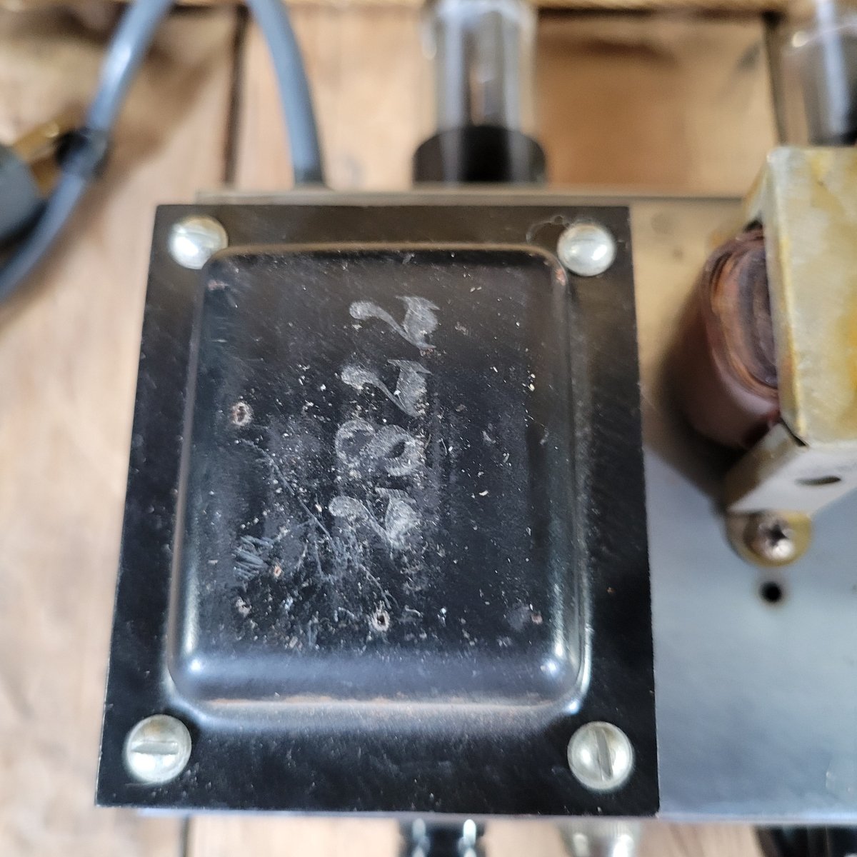 This example retains its original handle, tweed covering, grille, and transformers, showing far less than average wear.  The coveted piece of masking tape with the name Lily still lives inside the very-clean chassis.