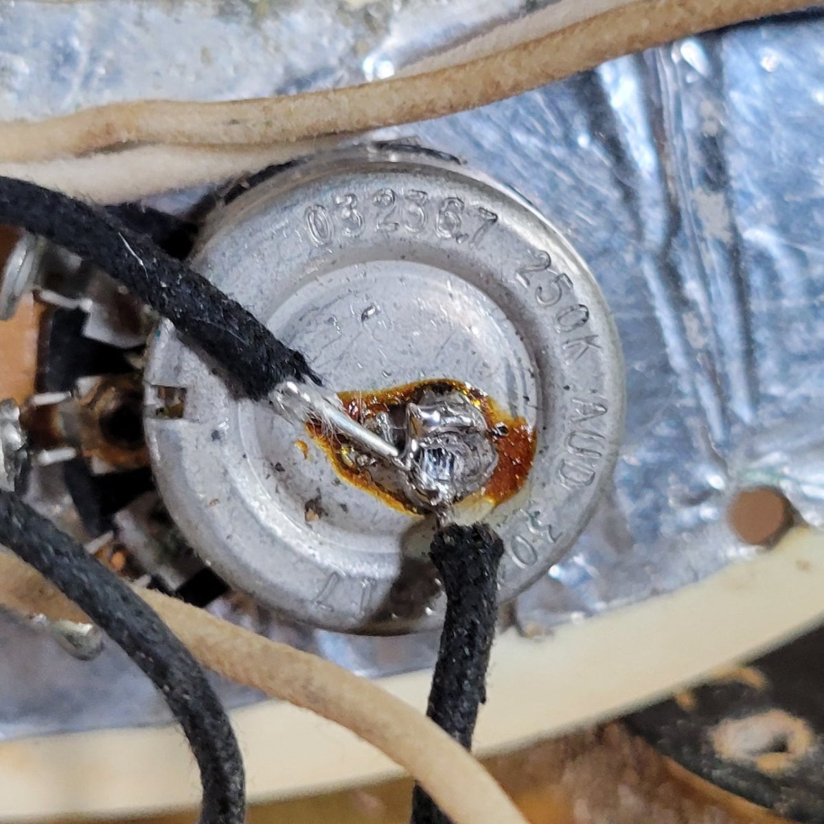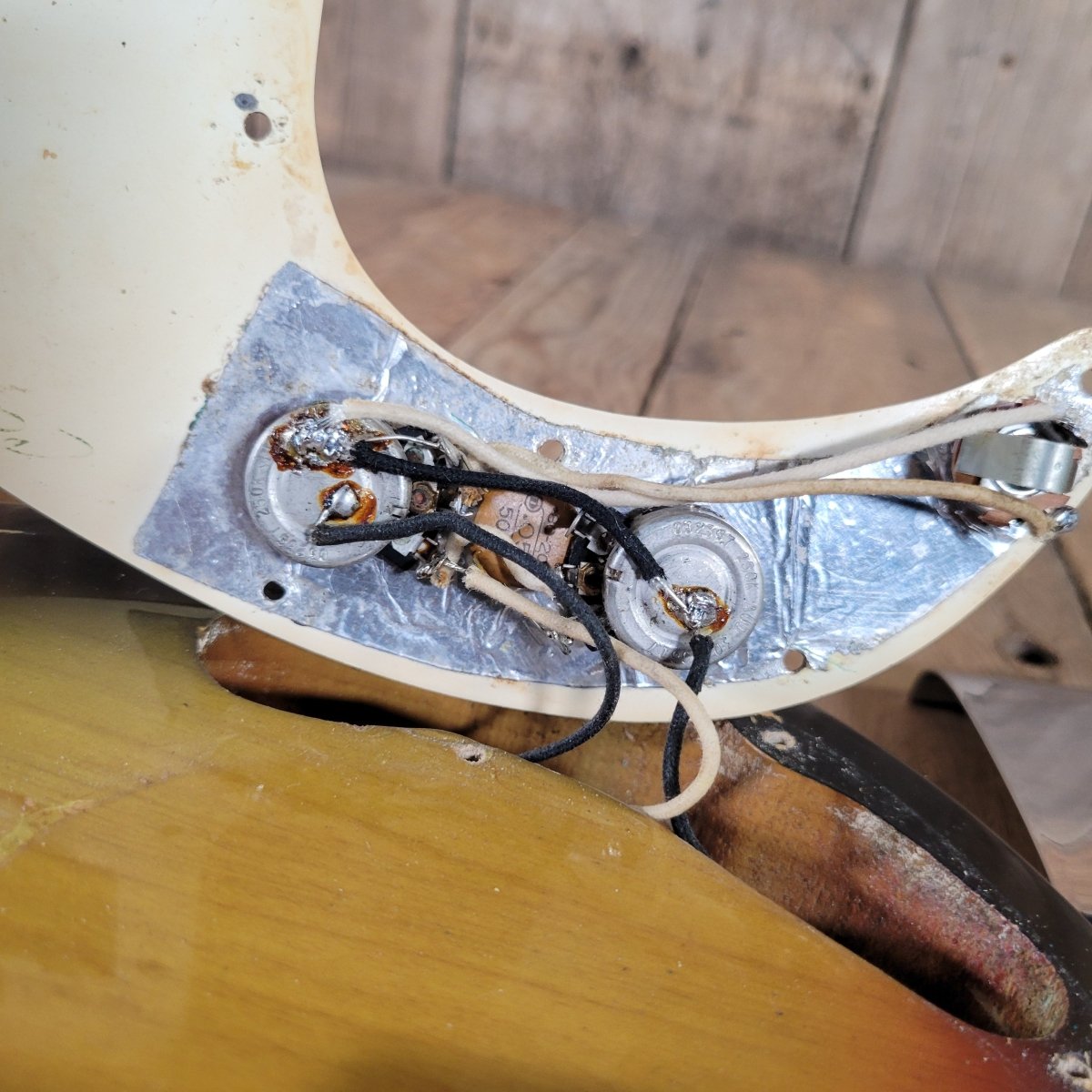This bass came to us with a 60s Fender pickguard in white with a pearloid back layer. This caused some consternation amongst potential customers, so we have sourced an original tortoise guard. There is no under-pickguard shield, but the rest of the bass is original. There has been some solder work done on the pots, and a ground wire added as the shield would normally have provided a ground connection for the pots and output jack.