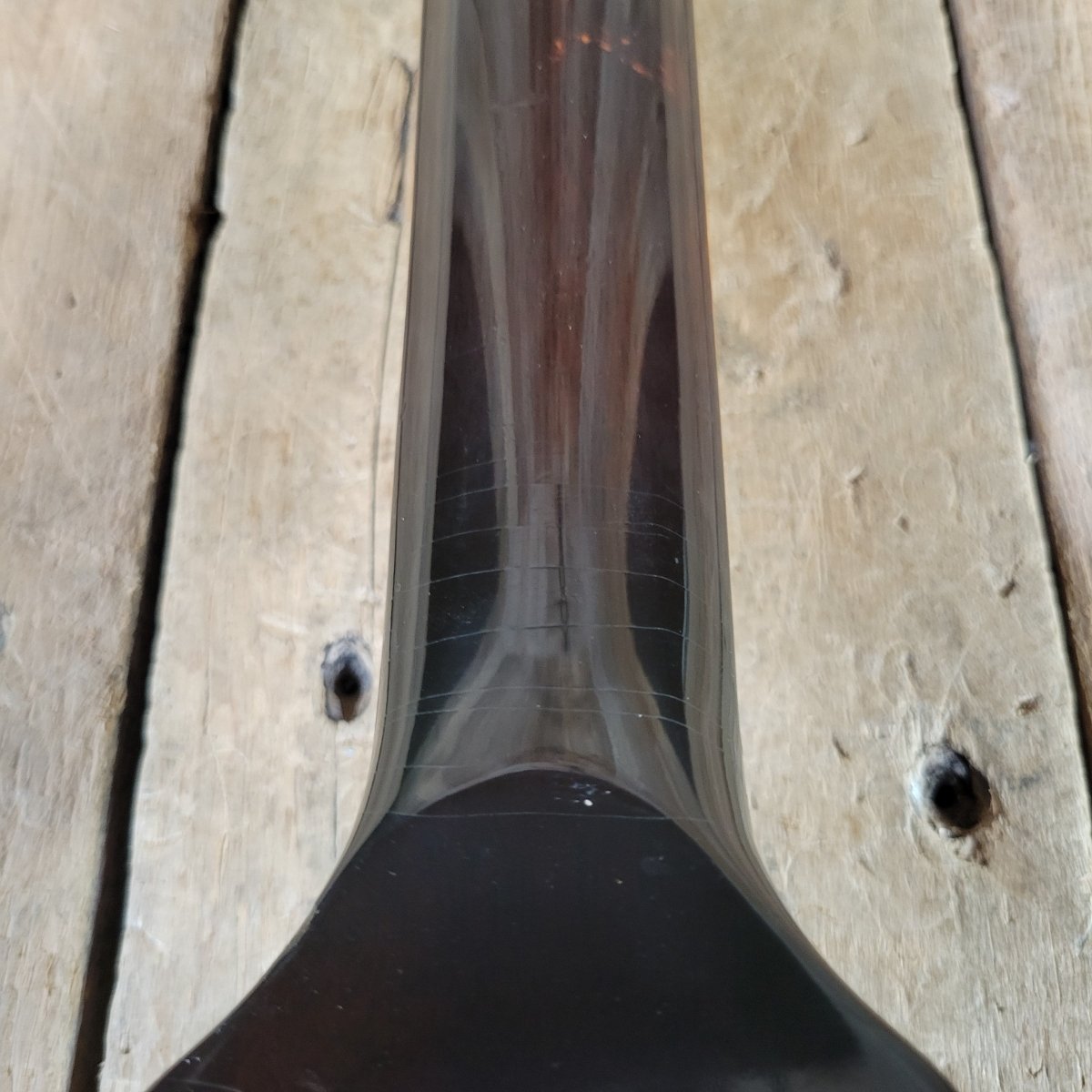 The guitar has seen a fair amount of play, evidenced by some light wear through the finish and some dings here and there. The frets are in great shape, and the action is low and super playable. The neck is straight and there is room in the truss rod for future neck relief adjustments.
