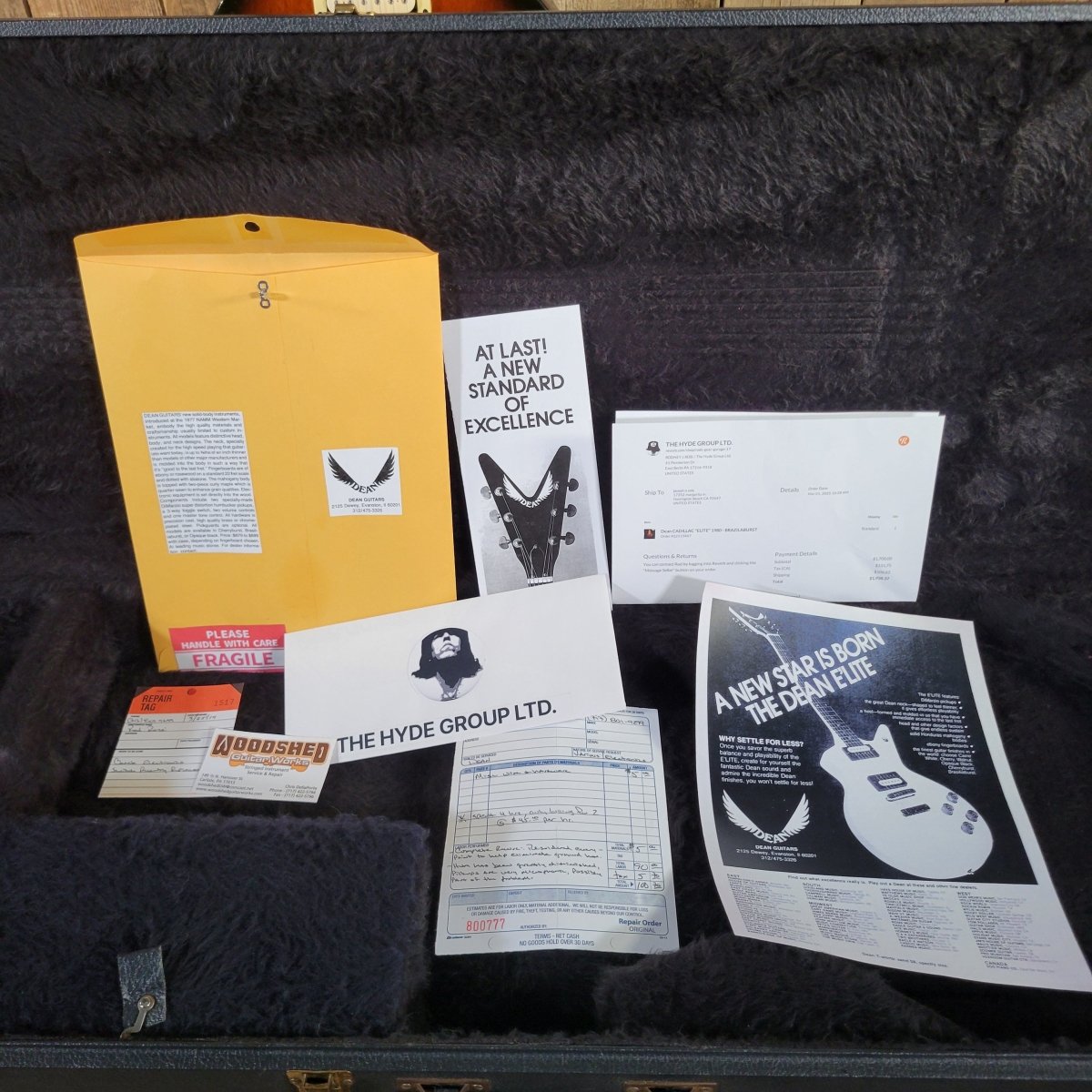 This 1980 Dean E’lite in Braziliaburst is an early example from Dean’s Chicago-era golden period—complete with its original hard shell case and paperwork. Some call this the Cadillac E'Lite because Dean started calling this body shape the Cadillac, but when it was launched in the late 70s this model was simply the E'Lite.