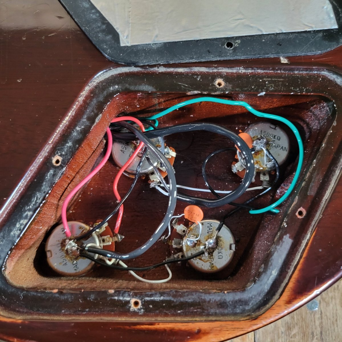 I'm pretty sure the pots are changed - I don't think they used Japanese pots in these guitars. I added the pair of 80s DiMarzio Super Distortion pickups as the guitar arrived here with a set of non original humbuckers. I've personally never been a big fan of these pickups, but they work really well in this guitar. The pickup rings are also not original to the guitar.