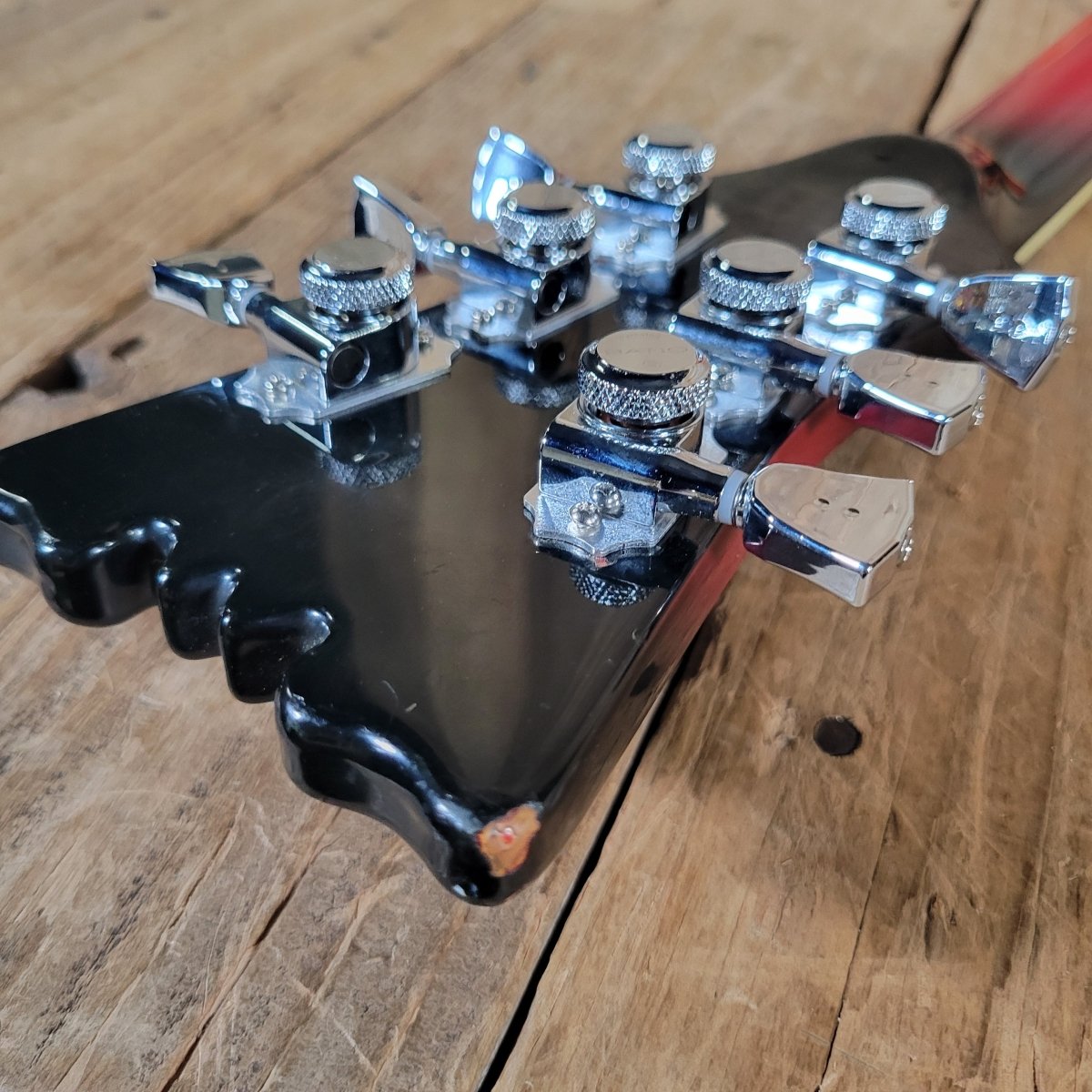 It sounds great and plays really well. The frets are low but playable, as is typical for Mosrite guitars.