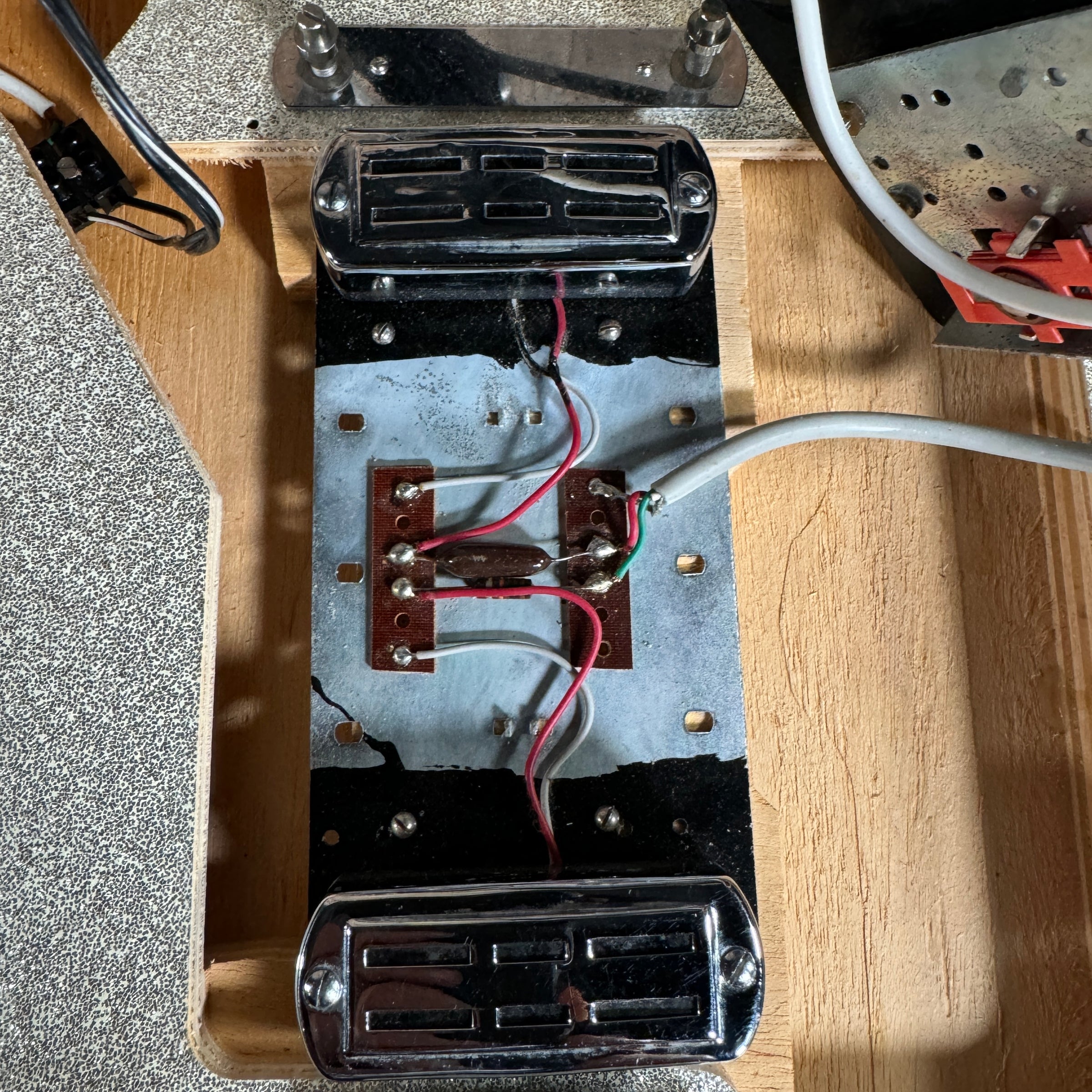With a plywood semi-hollow body and plastic coated silver sparkle top its a wonder it has managed to stay in such good shape. All original except for a changed output jack, and it even has the chrome bridge cover and original strap in the original case!! Switching for "All" both pickups on as well as individual "T" treble, "B" bass on/off and an "O" (for off I assume) quick kill switch. As groovy as it gets. I have an employee that goes crazy for these old Italian guitars and he would very much appreciate it if we can find this guitar a good home so he doesn't have to buy it himself.