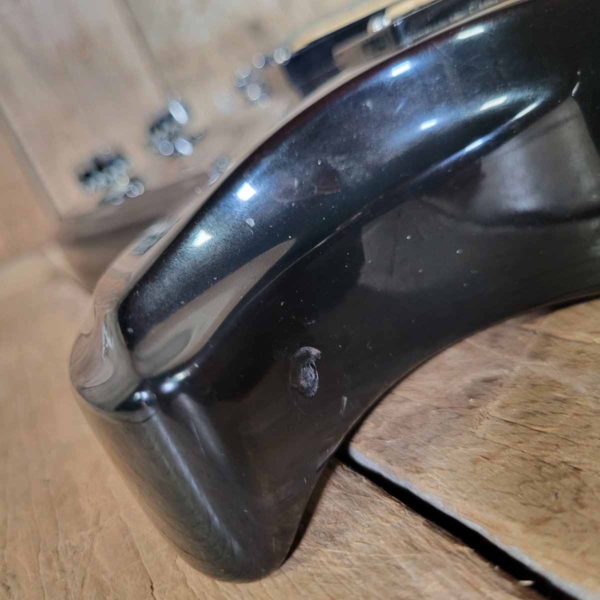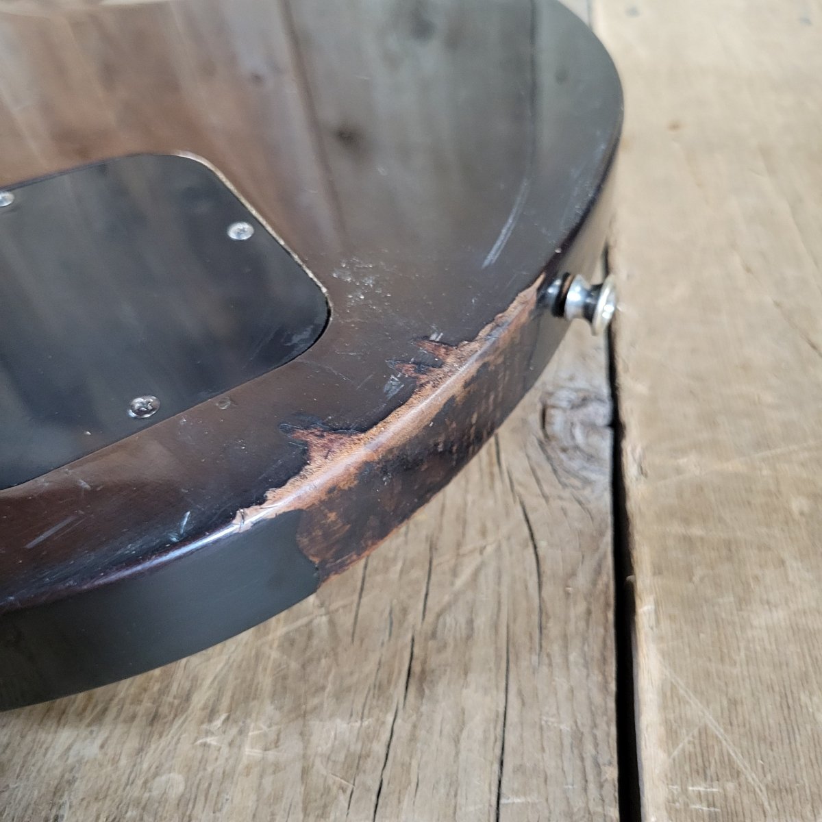 There is an area on the lower bout, on the front of the guitar where the finish chipped and the wood was touched up. Several smaller chips on the back edge were also touched up. There are some surface scratches on the back of the neck where the neck transitions to the headstock. Other dings are present - see the pics for details.