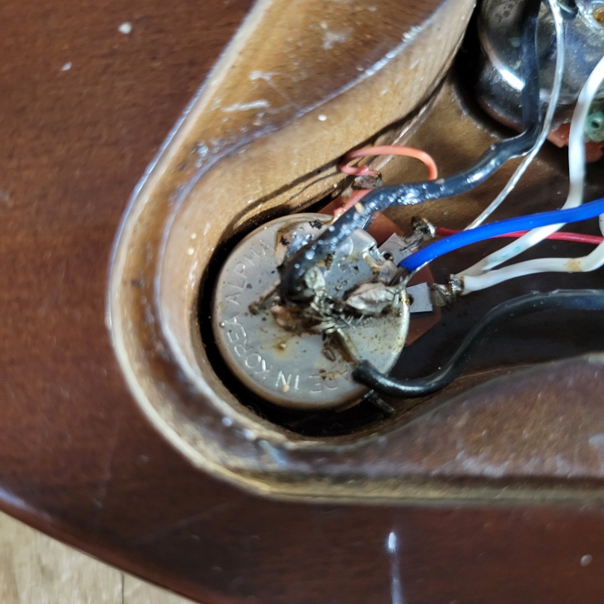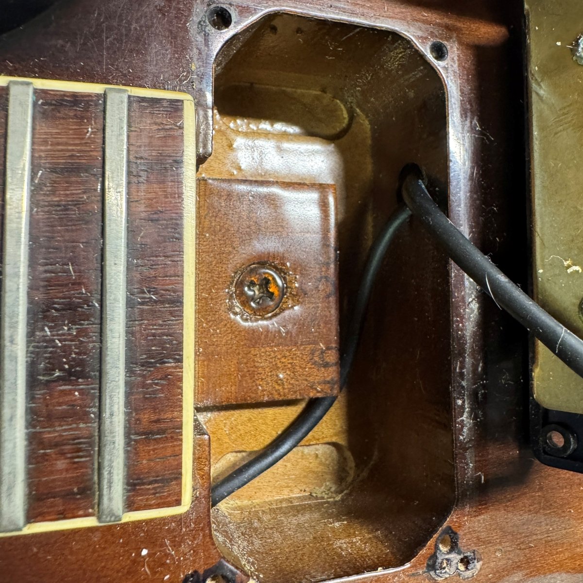 The guitar plays really well. The original frets are in excellent shape. The neck is straight and the truss rod has room for future neck relief adjustments. The screws on the output jack have been replaced. Wiring has been resoldered throughout the cavity, but everything works as it should.