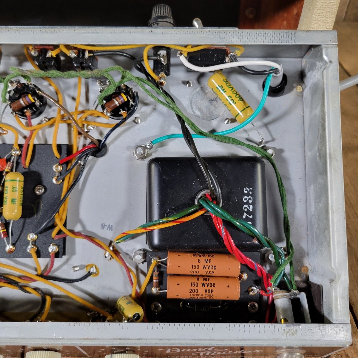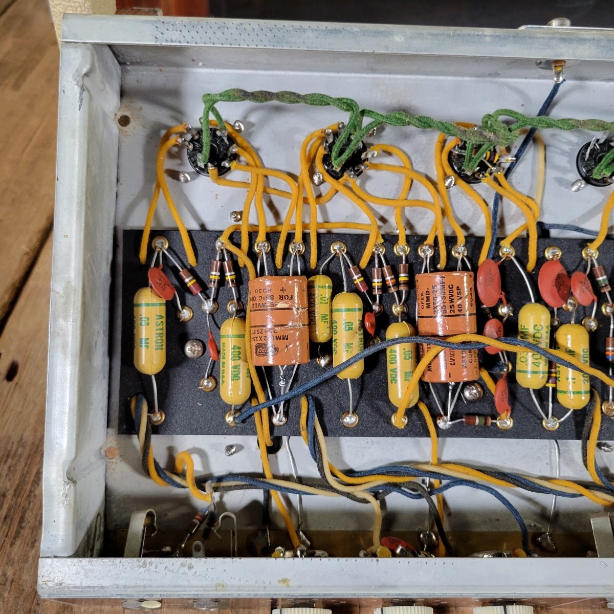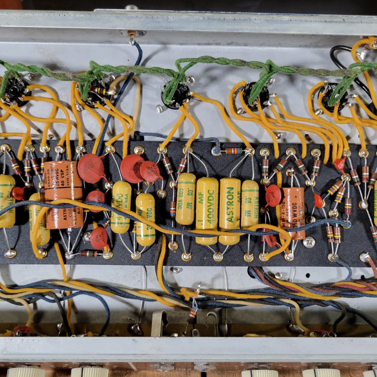 The amp has been fully serviced here in our shop, where I installed a new set of filter caps, hiding them inside the original Astron sleeves. I replaced the bypass caps as well. The original parts are included.