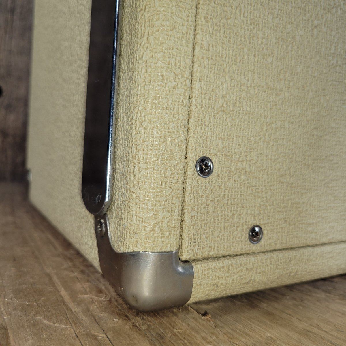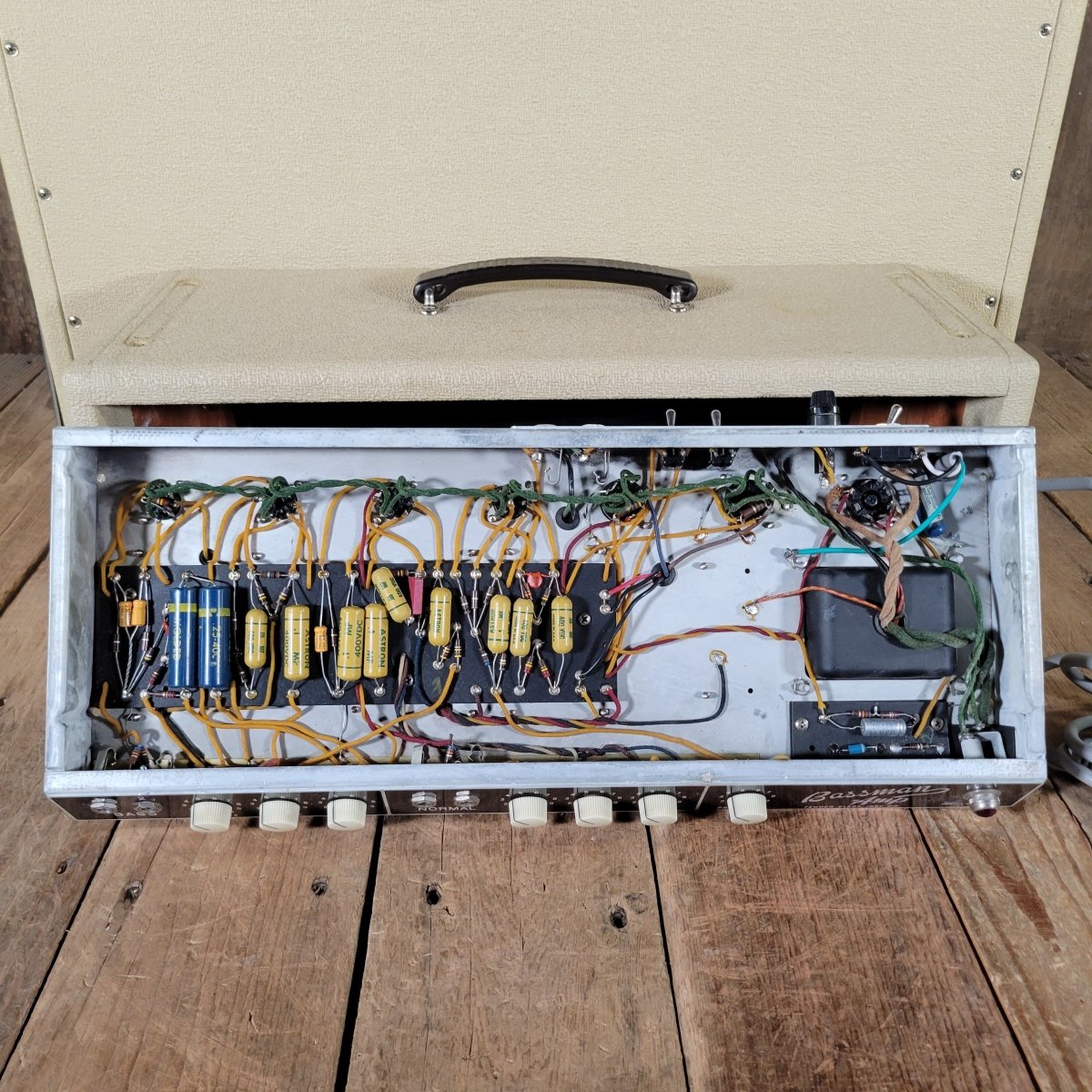 This 1961 Fender Bassman 6G6-A head with matching tone ring 1x12 cabinet in blonde tolex is a stunning, highly collectible example from Fender’s golden “blonde era.” Built during a pivotal transition between the tweed and blackface periods, this model represents the perfect blend of warmth, power, and precision that defined Leo Fender’s early ’60s amplifiers. The 6G6-A circuit is revered for its punchy response, articulate cleans, and rich harmonic overtones, making it one of the most sought-after vintage Bassman designs.