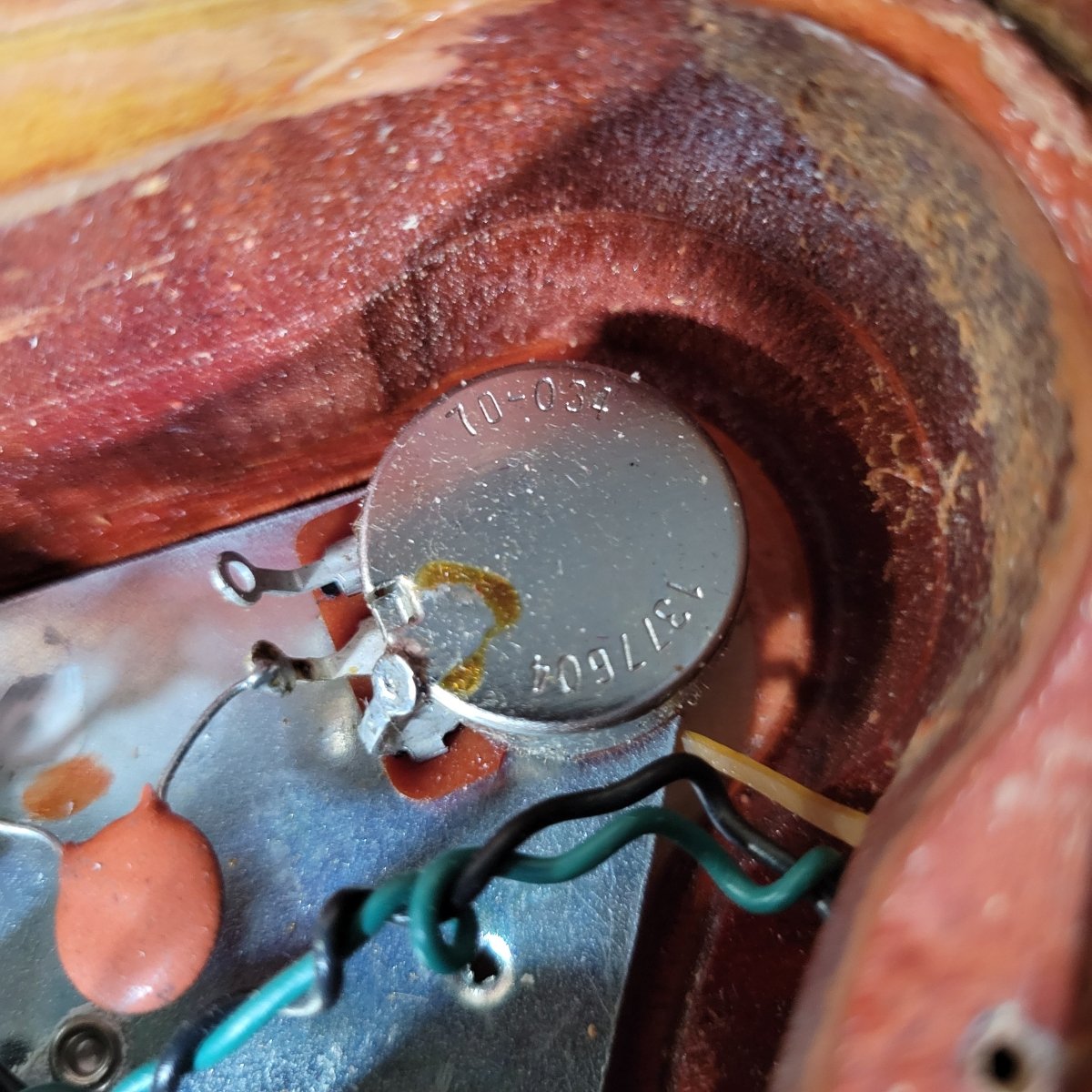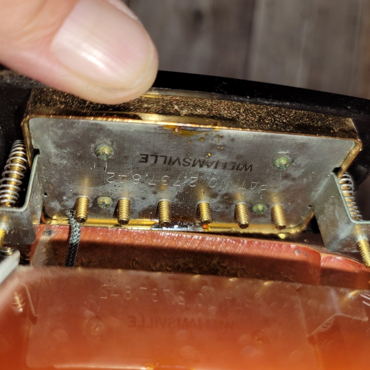 The original patent-stamped T-Top humbuckers are original and unmolested. They're stamped "Williamsville" - pickups that were made in a former Moog Music factory in Williamsville, NY, which Gibson used for a short period in the 1970s to manufacture some of its products. The control cavity is also 100% original, with pots dated to 1976.