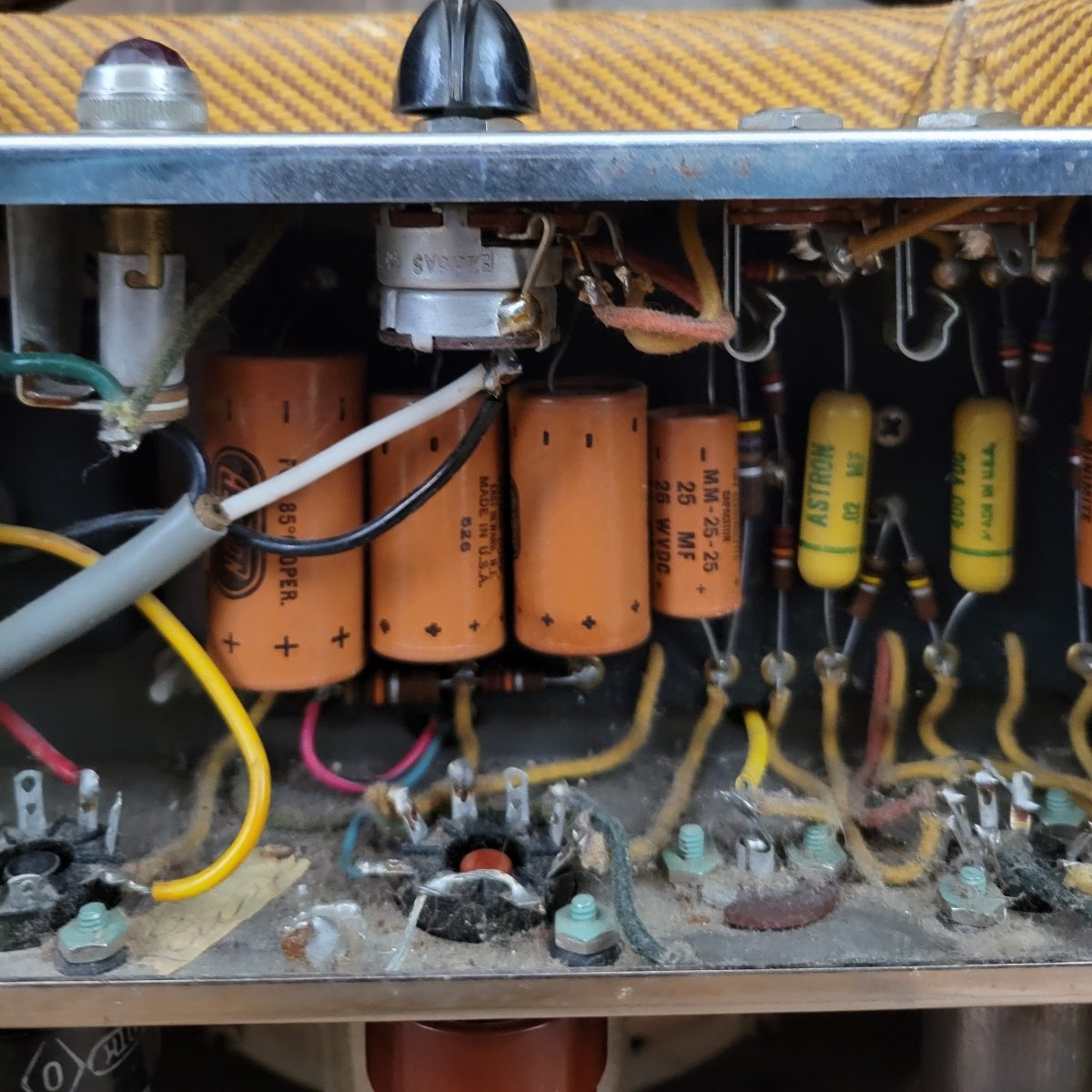 Here we have a great sounding Champ from 1958. The amp is in reasonably good condition. The handle looks to be either a really nice replacement or a remarkably resilient original.