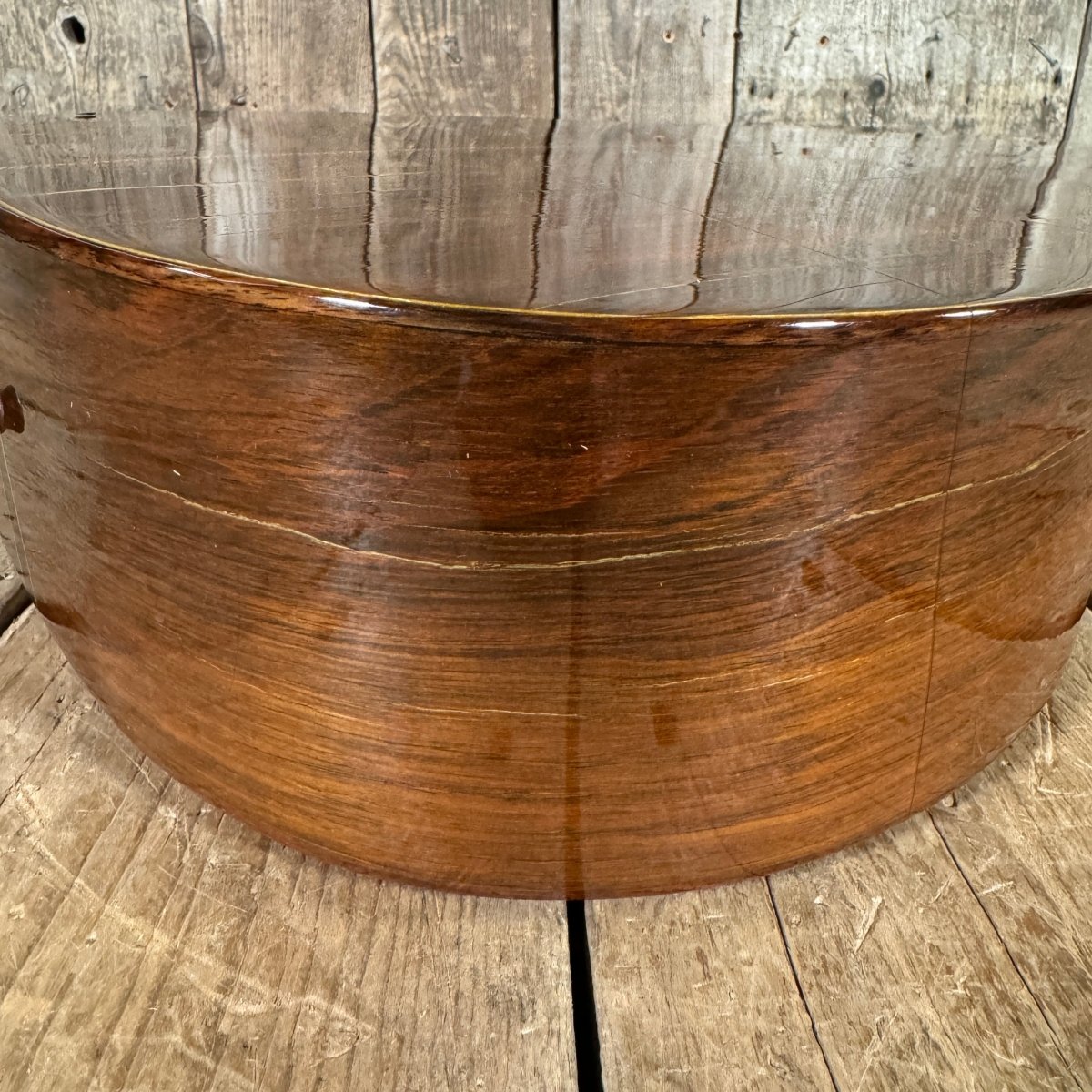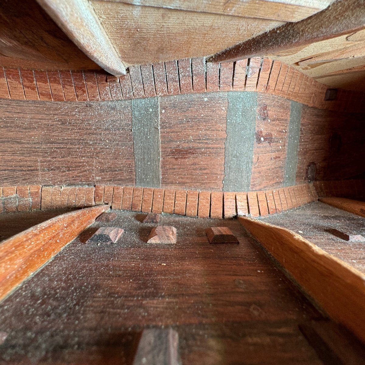 There are numerous crack repairs throughout - top, sides and back.  Someone did the work with care, staining the splines used on the back and even re-building a section of the rosette, herringbone and all.  This section is on the bridge side of the soundhole, directly under the strings.  There is a strip of Brazilian rosewood that was patched on the side - the lower bout near the top of the guitar.  There are two sections of Brazilian binding on the back that were patched, a one-inch section on the bass side and a longer one on the treble side.