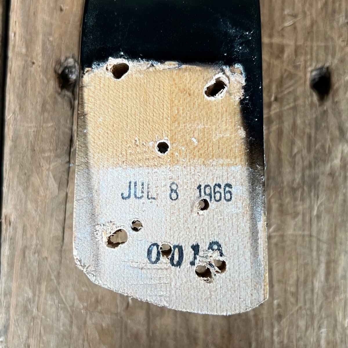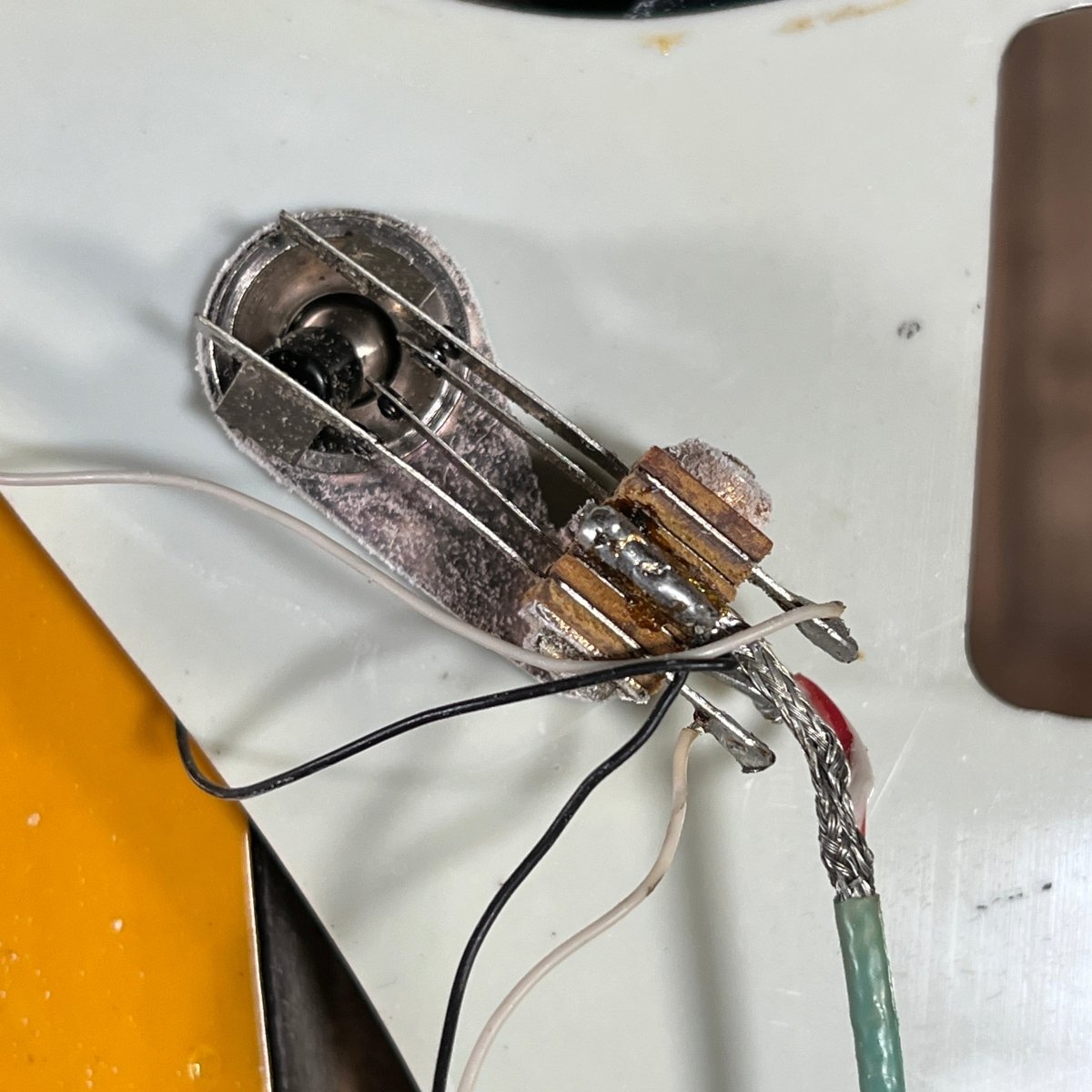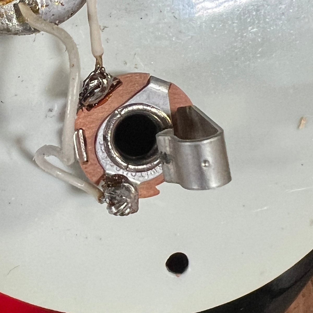 I was surprised to see the neck pickup cavity altered when we did our deep-dive for pictures. I always wonder why someone would alter a fine guitar like this, but somewhere along the line someone figured a humbucker or something would be better in the neck position than the Mosrite pickup. Fortunately, all the original parts were eventually returned to the guitar, and the route is not visible with everything back in position. Solder joints on the pots were altered but the work was done in a reasonably clean way.