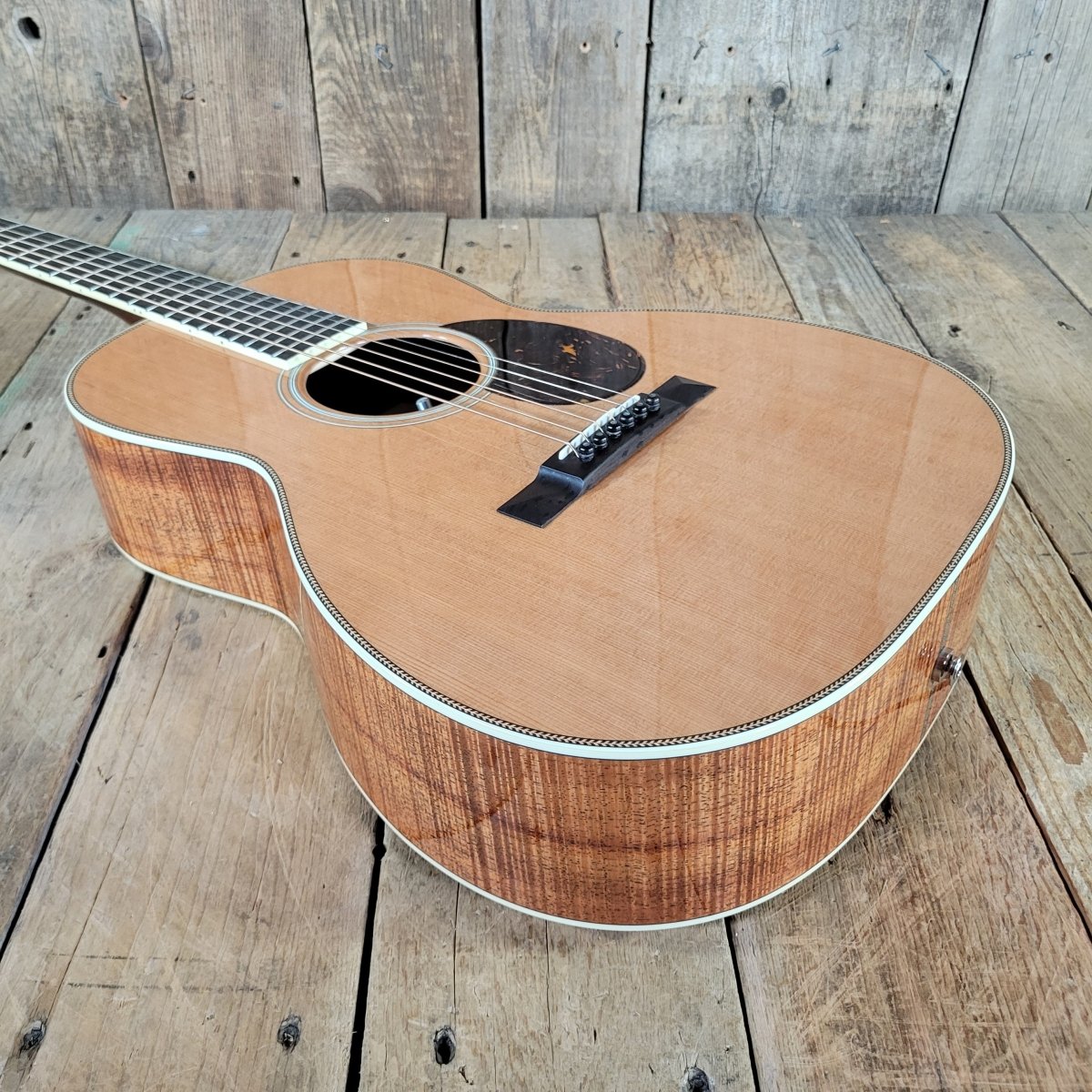 This 2024 Santa Cruz 00 model with a beautiful, tightly grained Red Cedar top and stunning AAAA-grade Koa back and sides is a world-class boutique acoustic guitar built for tone, balance, and expressive nuance. This thing rings like a piano. It really is stunning. The craftsmanship is impeccable.