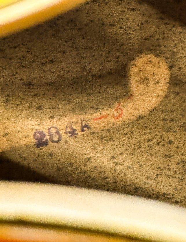1942-1947: Factory Order Numbers with 3 or 4 digits, followed by a hyphen, followed by 1 or 2 more digits, ink stamped on neck block (flattops) or on the inside back,