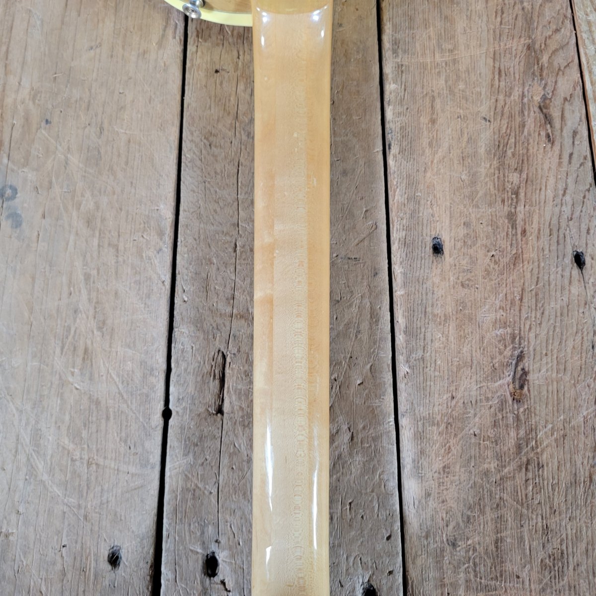 This example is kind of interesting, resembling the Randy Scruggs model, but without the vine inlay on the neck. I looked for quite a while, and I couldn't find another example with dot inlays and the abalone purfling around the top of the body. Everything I saw had split pearloid/abalone inlays or the typical Scruggs vine inlay.